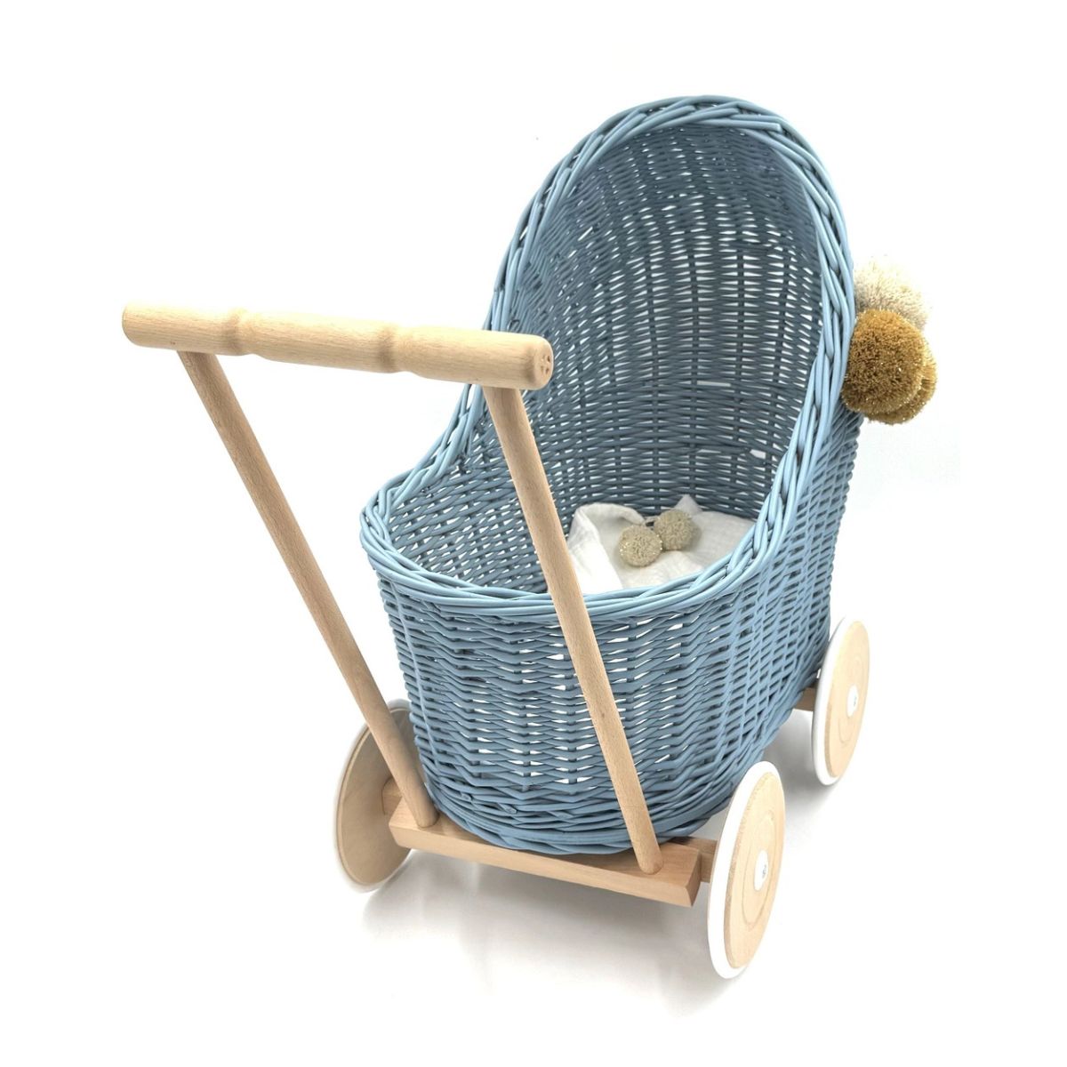 Wózek jest pomalowany nietoksyczną farbą na bazie wody, bezpieczną nawet dla najmłodszych. Posiada drewniane koła z gumową powłoką, które zapewniają cichą i płynną jazdę, nie rysując podłogi. W zestawie znajduje się także miękka muślinowa pościel – idealna do drzemek ukochanych lalek, misiów i zabawek. Dostępnych jest kilka kolorów i wzorów, które pozwalają dopasować wózek do stylu pokoju lub upodobań dziecka.
