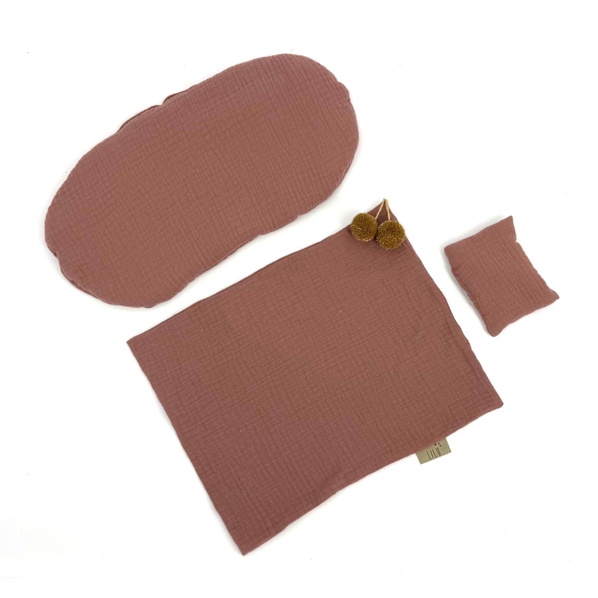 Wózek jest pomalowany nietoksyczną farbą na bazie wody, bezpieczną nawet dla najmłodszych. Posiada drewniane koła z gumową powłoką, które zapewniają cichą i płynną jazdę, nie rysując podłogi. W zestawie znajduje się także miękka muślinowa pościel – idealna do drzemek ukochanych lalek, misiów i zabawek. Dostępnych jest kilka kolorów i wzorów, które pozwalają dopasować wózek do stylu pokoju lub upodobań dziecka.