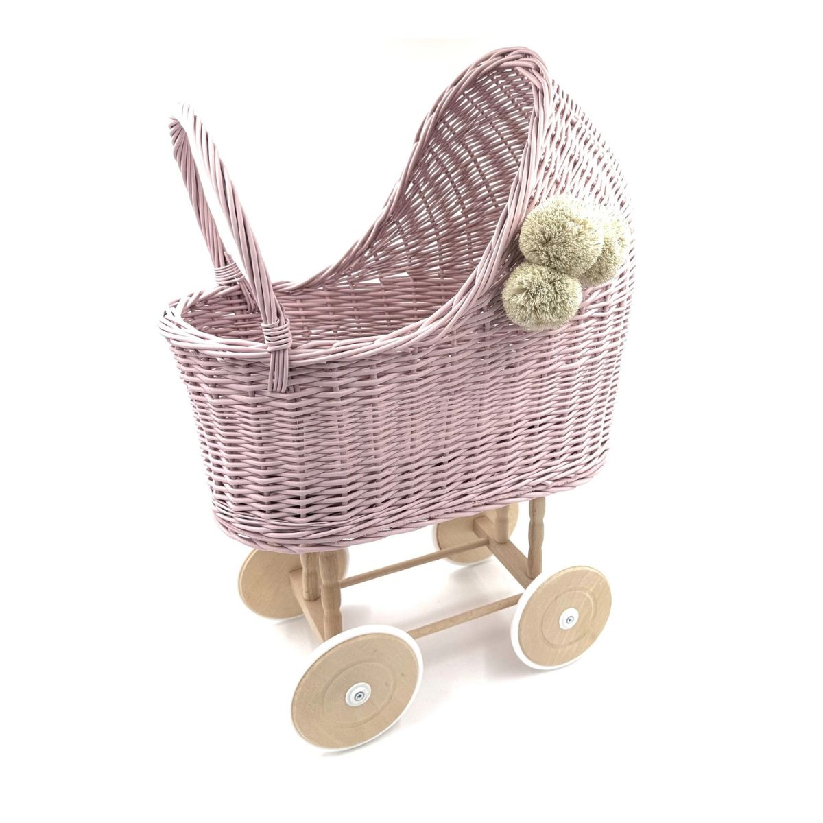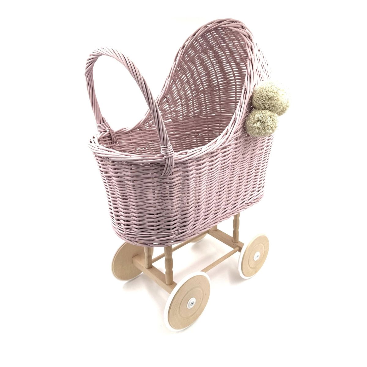 Wózek jest pomalowany nietoksyczną farbą na bazie wody, bezpieczną nawet dla najmłodszych. Gondola i uchwyt wózka zostały wykonane w 100% z naturalnej wikliny, a koła i podwozie – z surowego drewna. Dla większego komfortu i bezpieczeństwa, koła zostały ogumowane, dzięki czemu wózek porusza się cicho i nie rysuje podłogi.