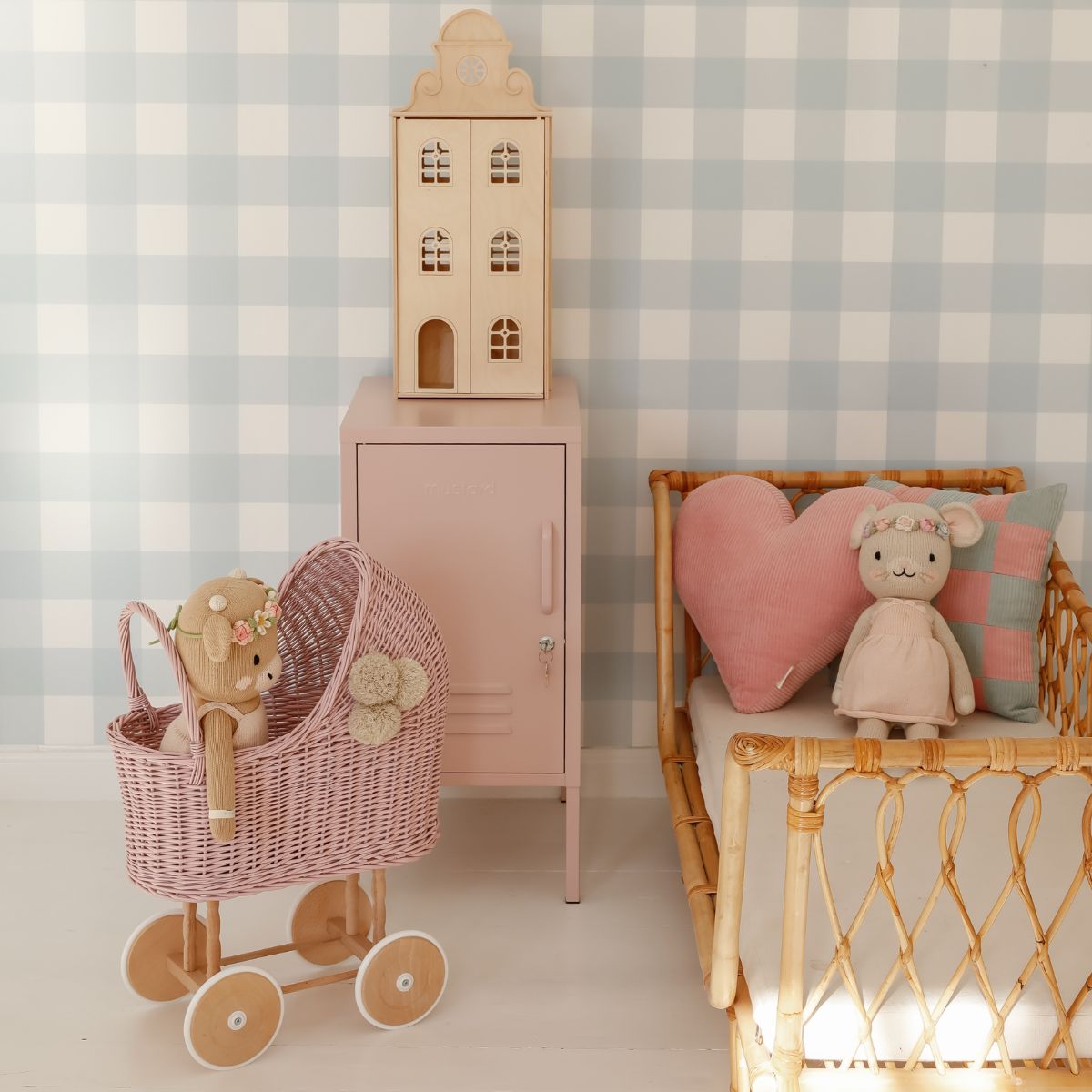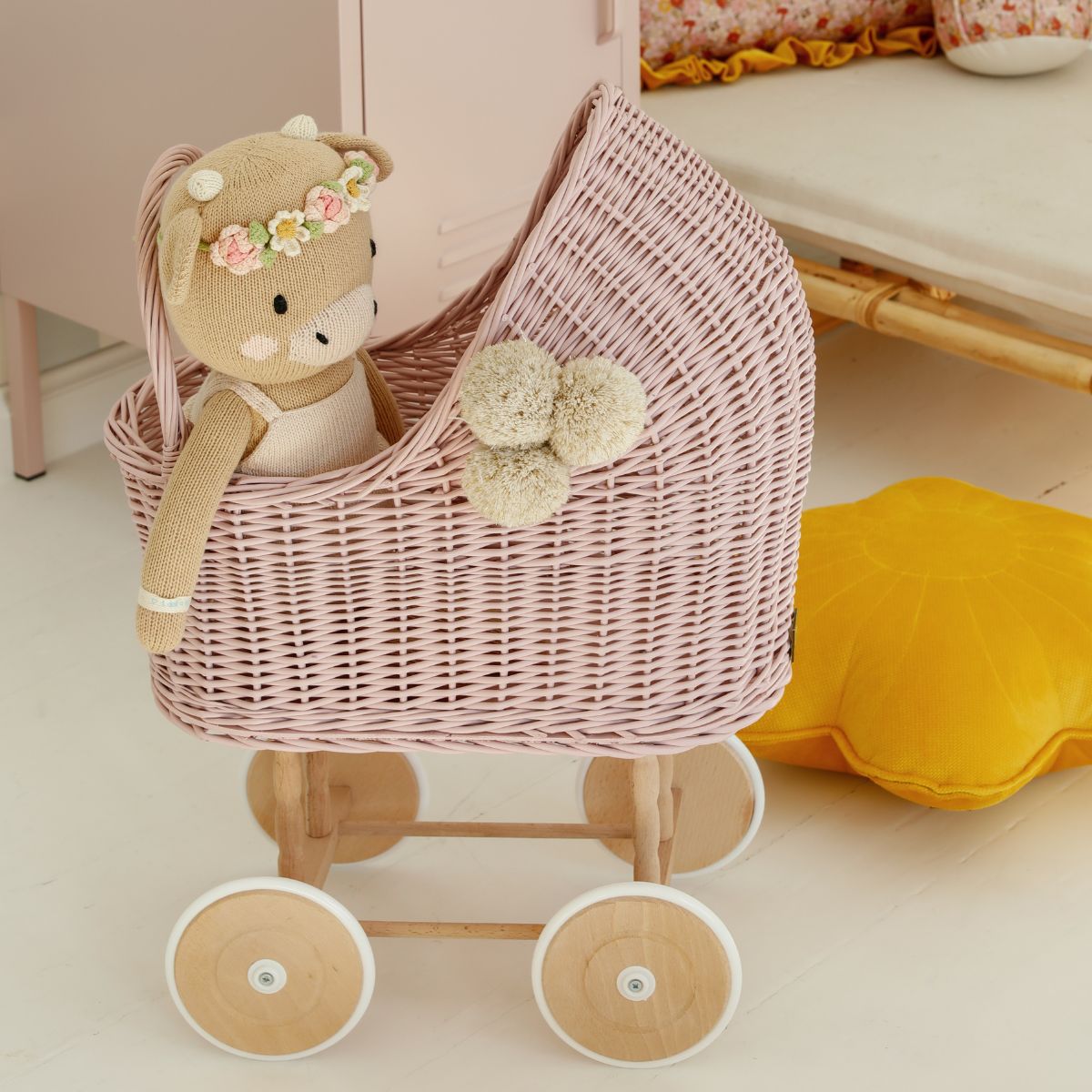 Każdy wózek powstaje ręcznie w Polsce, z miłością i dbałością o najmniejszy detal. Naturalna wiklina nadaje mu lekkości i trwałości, a delikatne zaokrąglenia sprawiają, że wygląda uroczo w każdym dziecięcym pokoju.