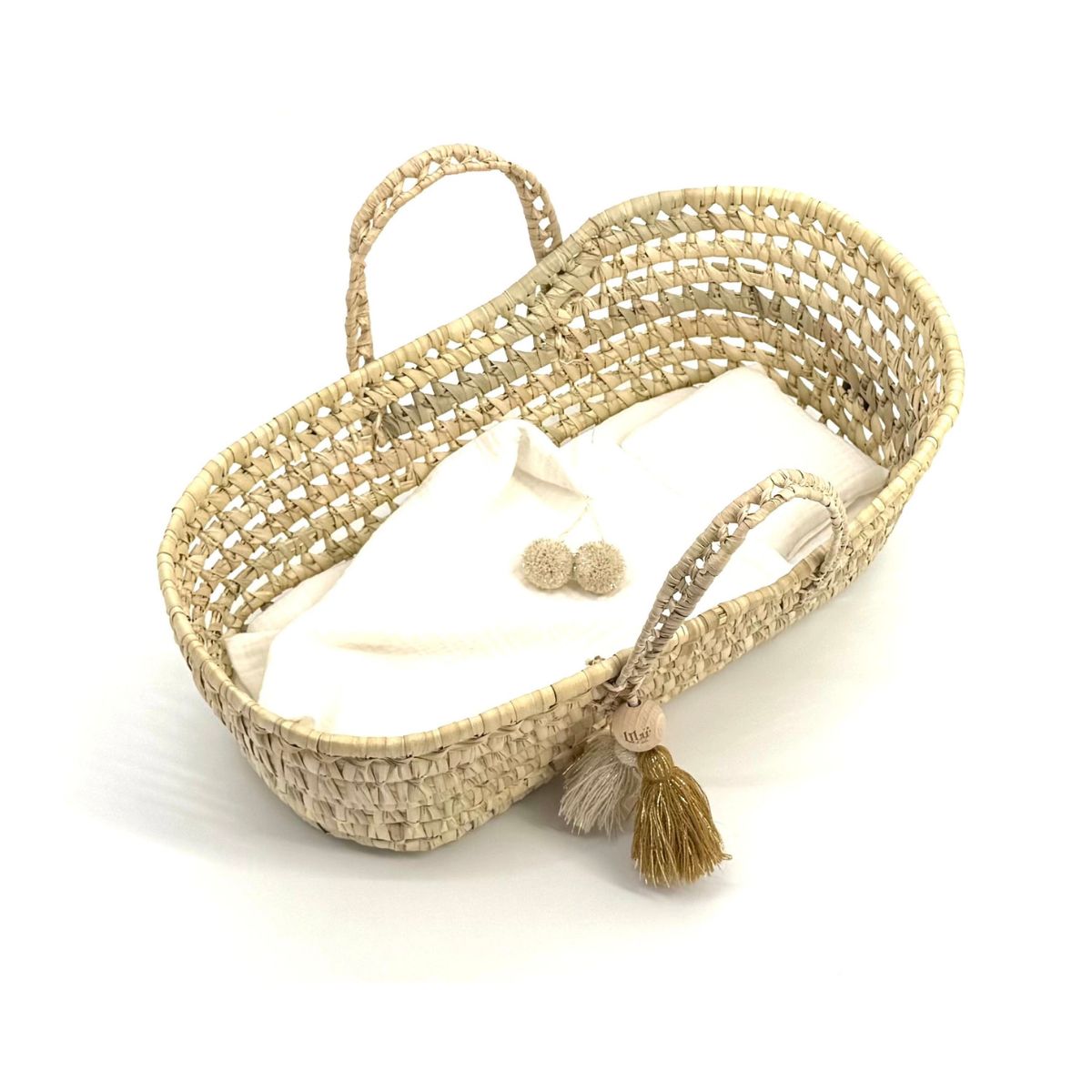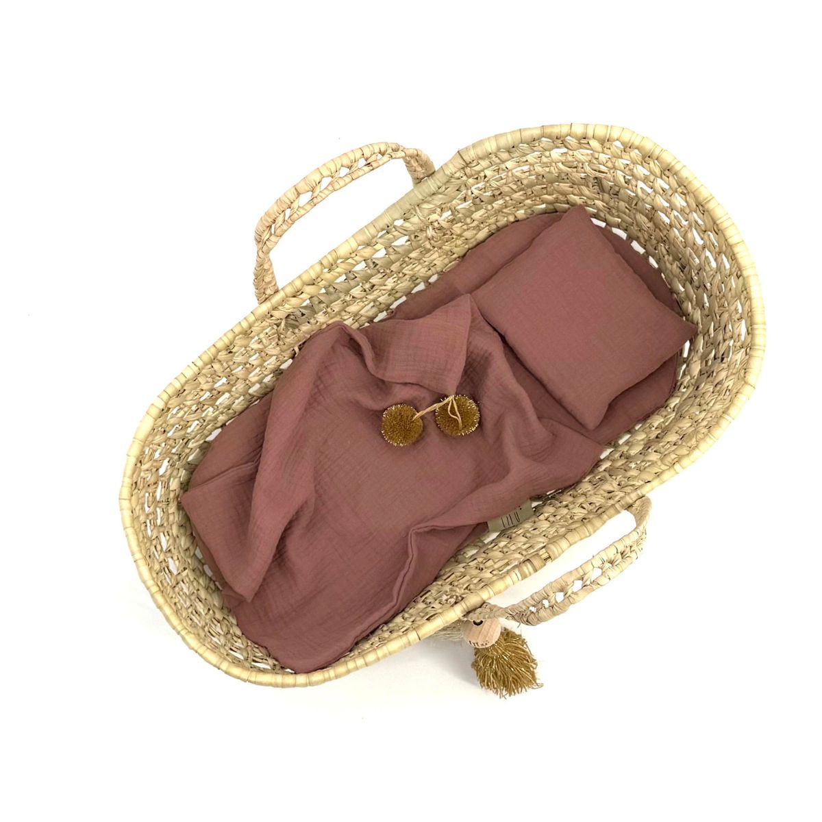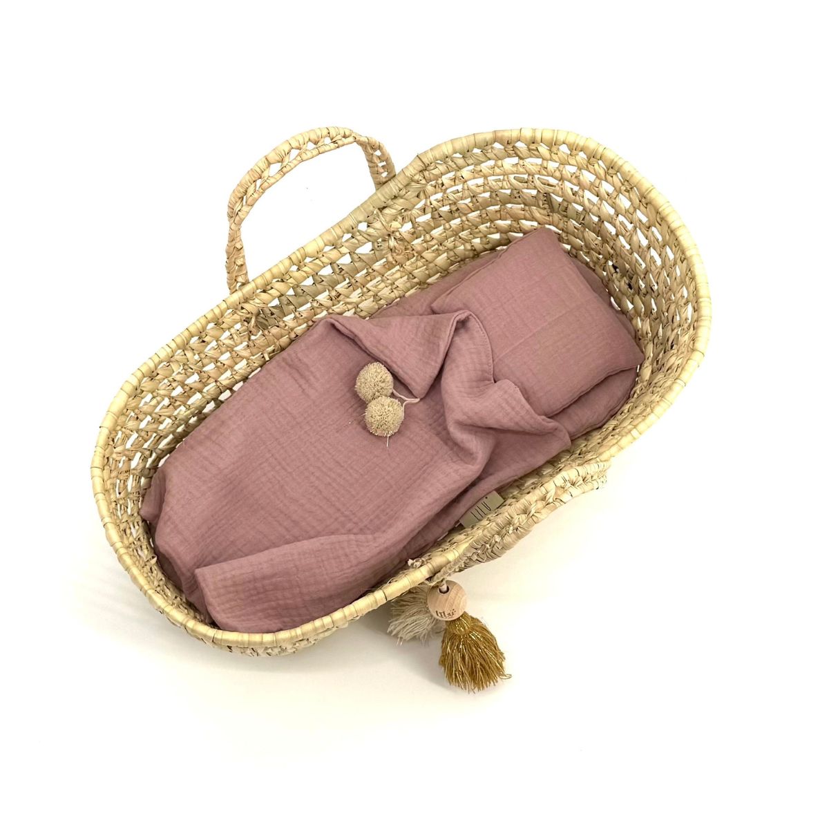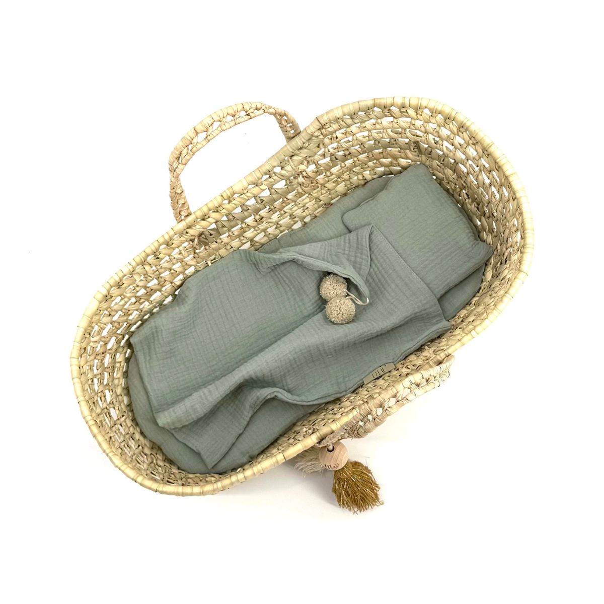 Kosz dla lalek Dream – ręcznie pleciony z liści palmy z zestawem muślinowej pościeli