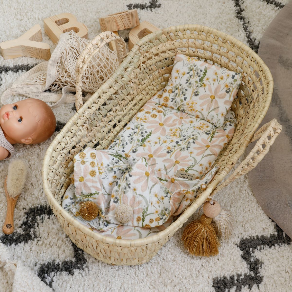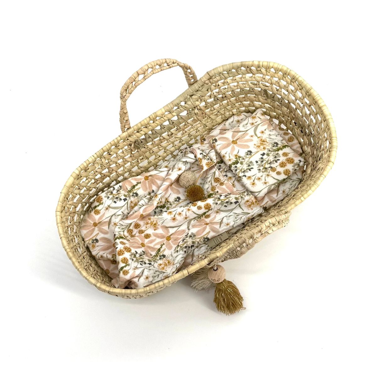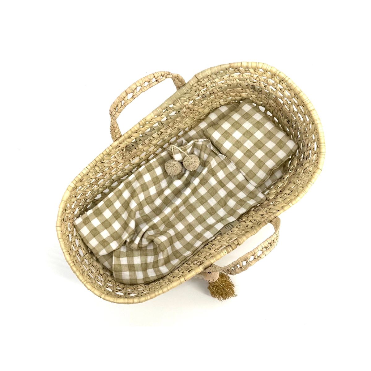 Kosz dla lalek Dream – ręcznie pleciony z liści palmy z zestawem muślinowej pościeli