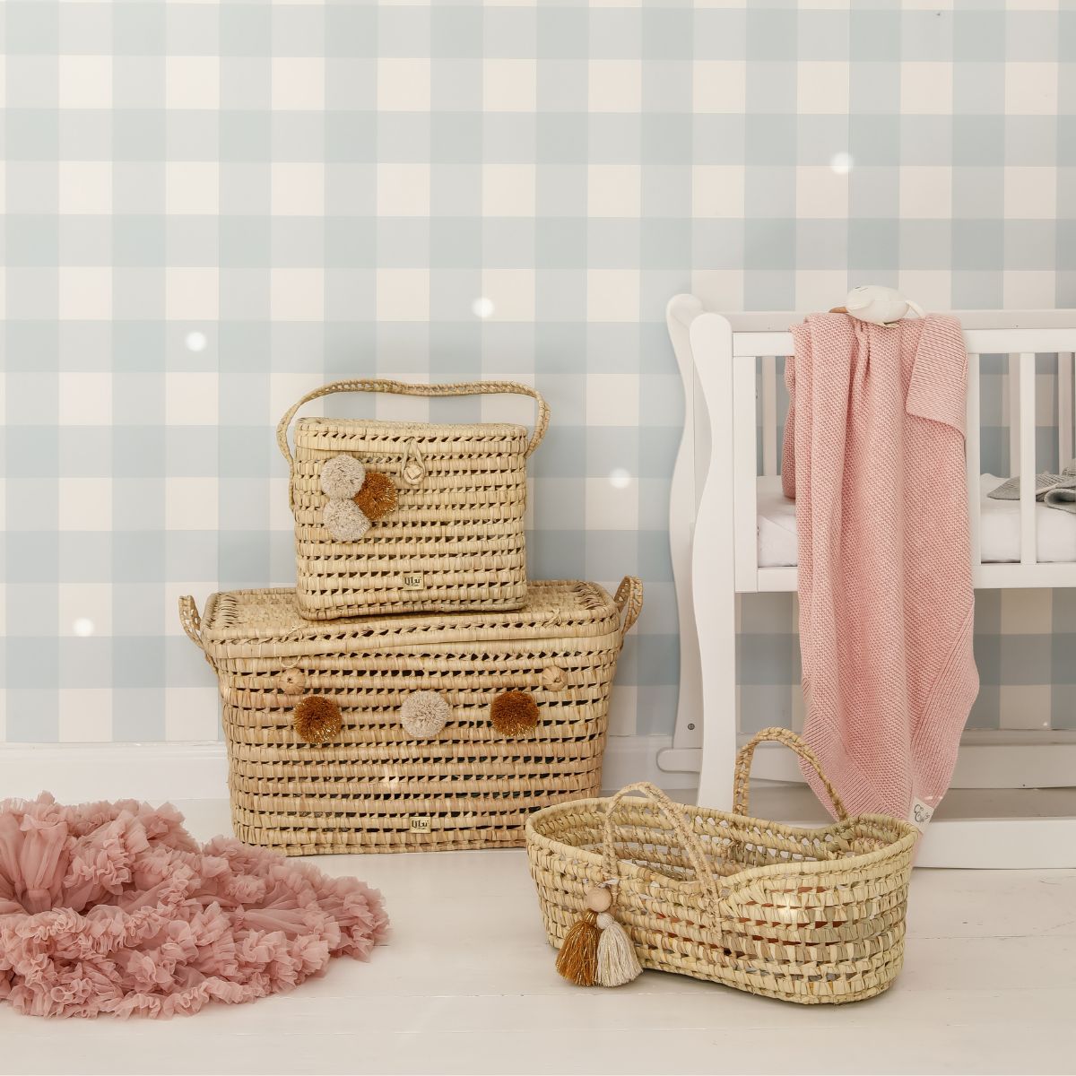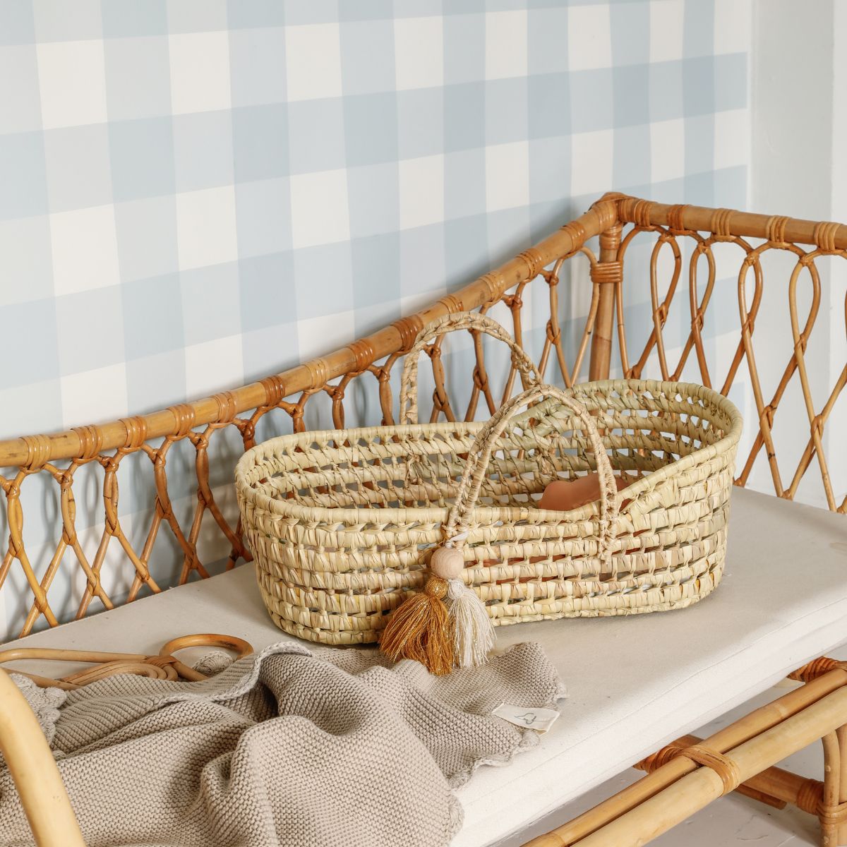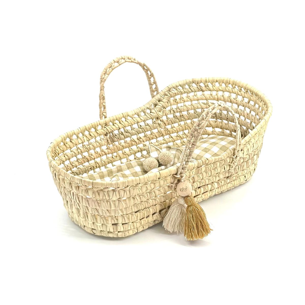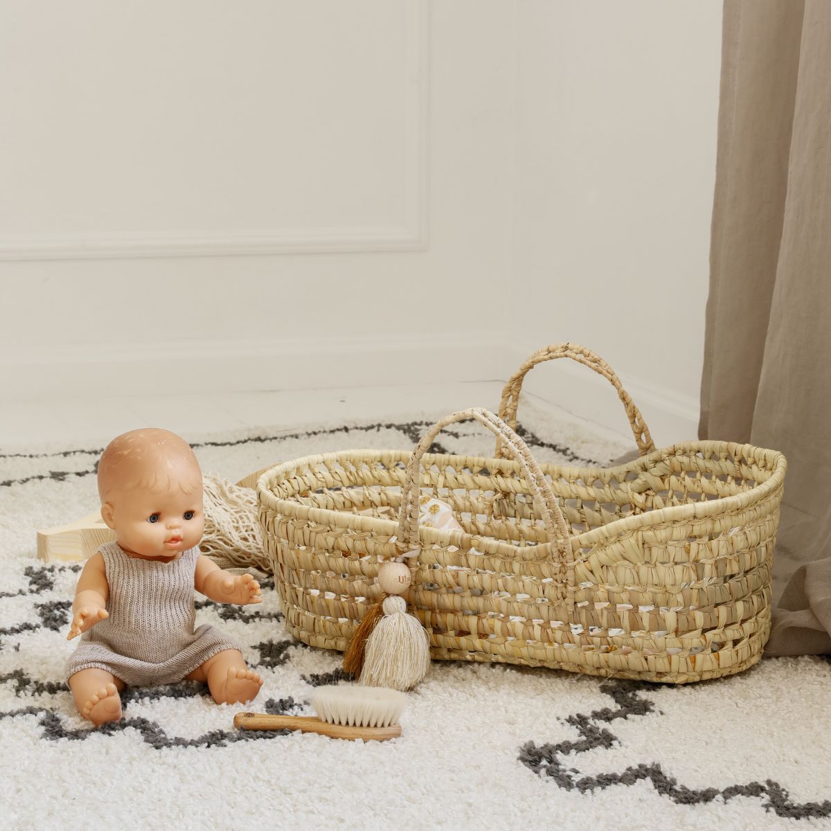 Kosz dla lalek Dream – ręcznie pleciony z liści palmy z zestawem muślinowej pościeli