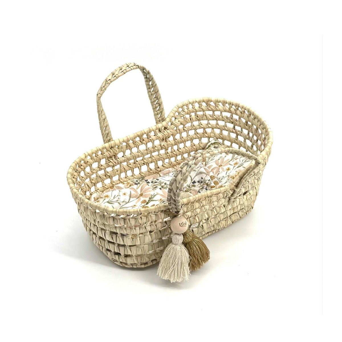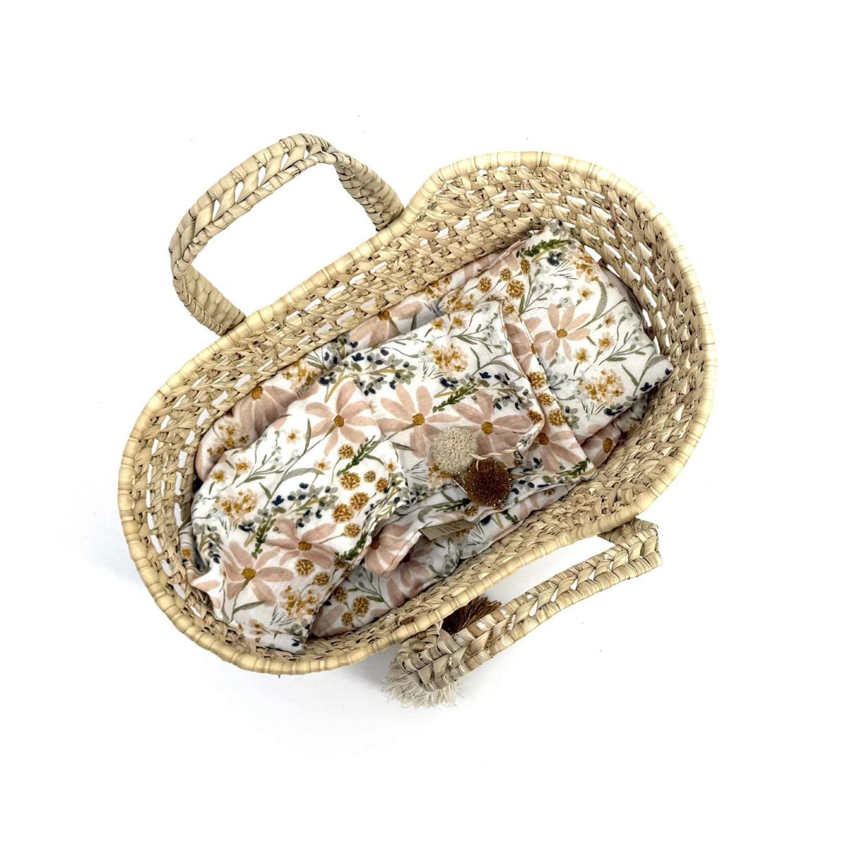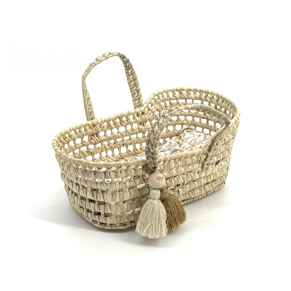 Kosz dla lalek Dream – ręcznie pleciony z liści palmy z zestawem muślinowej pościeli