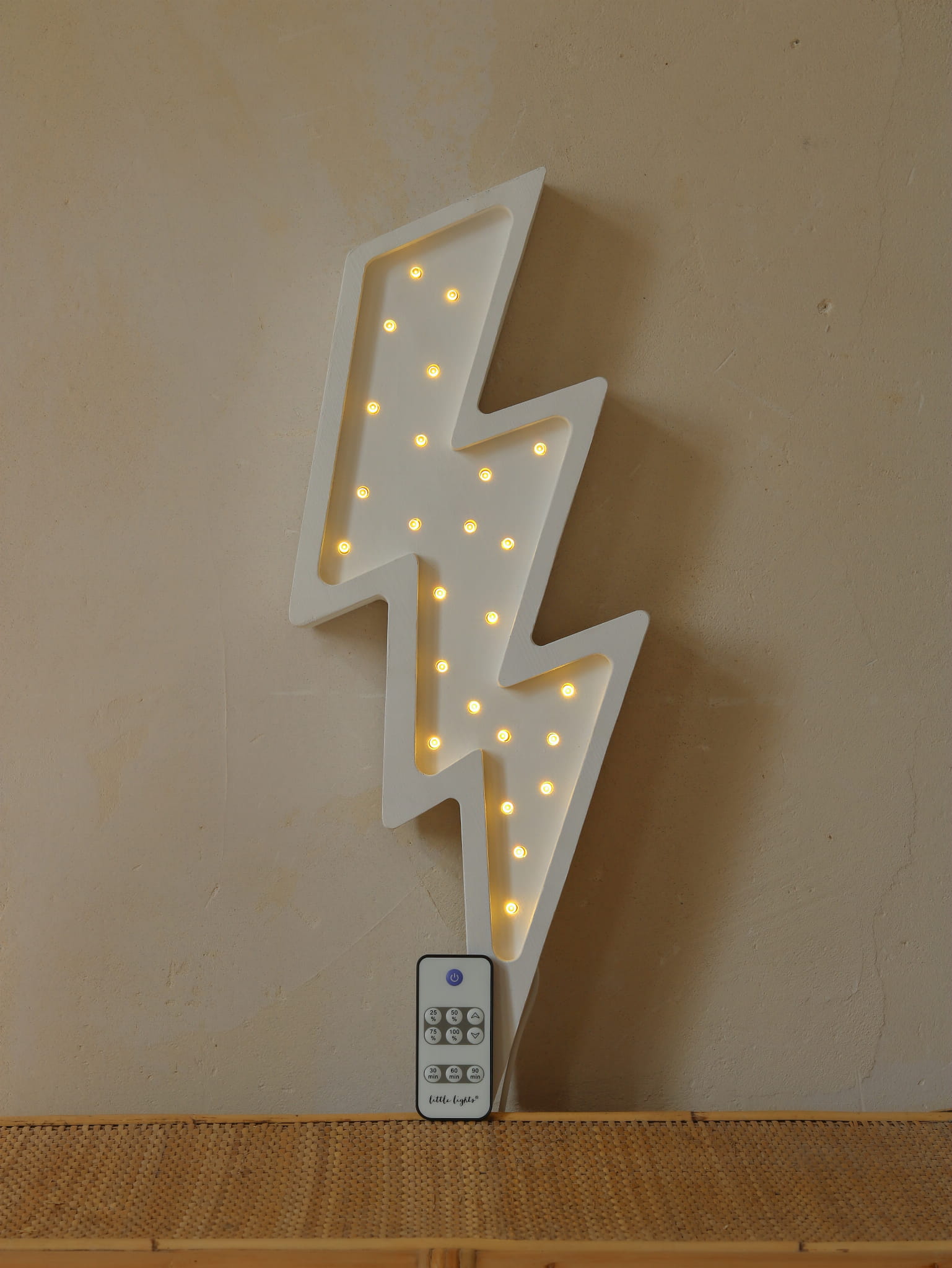 Lampka Piorun wyposażona jest w ściemniacz, dzięki czemu sami możecie regulować natężenie światła. Włącznik oraz ściemniacz znajduje się na pilocie dołączonym do lampy. Jednym kliknięciem możecie także ustawić timer- 30 min, 60 min lub 90 min. Po tym czasie lampa wyłączy się samodzielnie.