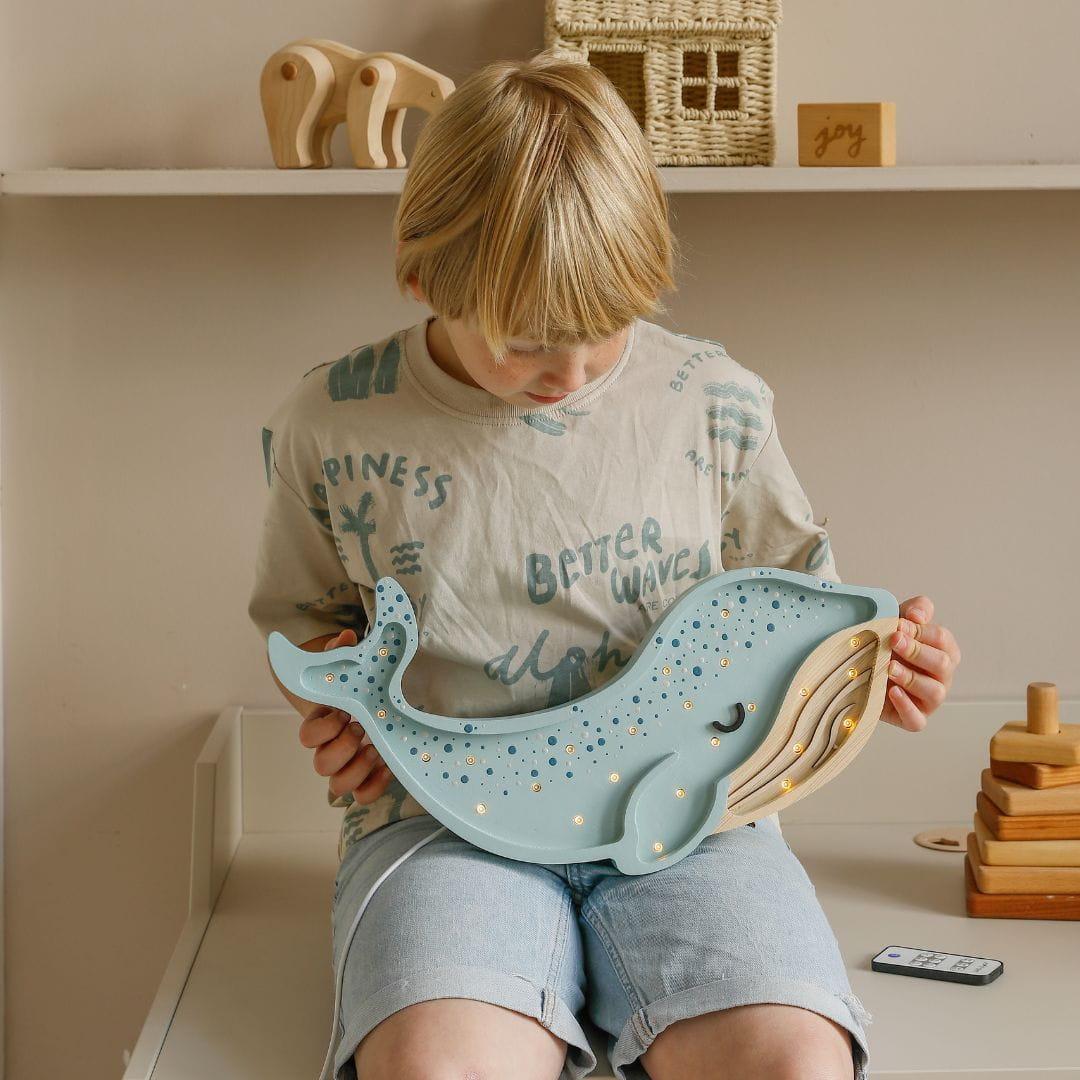 Lampka nocna Wieloryb z pewnością przypadnie do gustu Twojemu dziecku i będzie nie tylko oświetlać wnętrze pokoju, ale też stanowić ciekawy element wystroju. Będzie się pięknie komponowała w pokoikach z motywem morskim.
