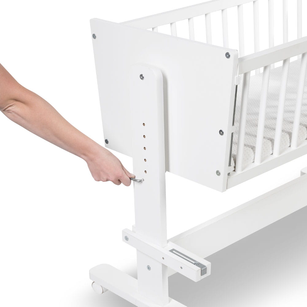 wysokość łóżeczka można dopasować poprzez specjalne otwory umieszczone na nogach łóżka.