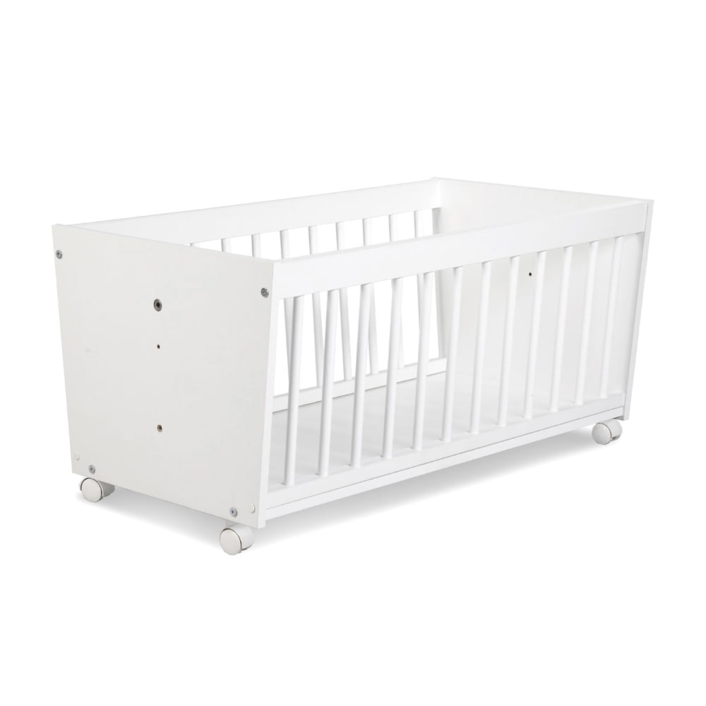 Ramiaki boków łóżeczka wykonane są z płyty MDF, szczebelki z drewna sosnowego, a szczyty, dno i nogi z płyty meblowej.