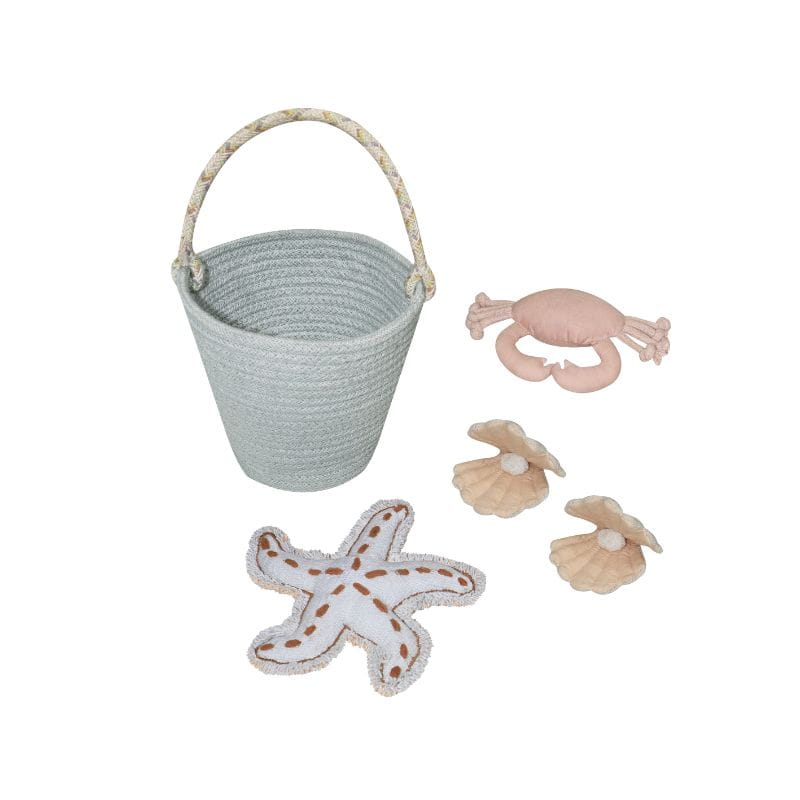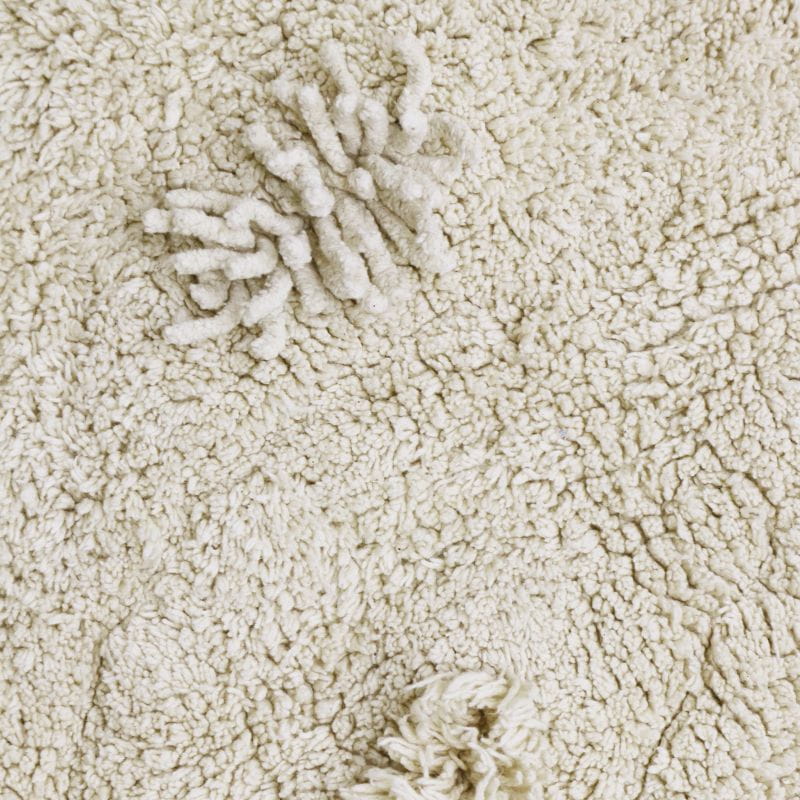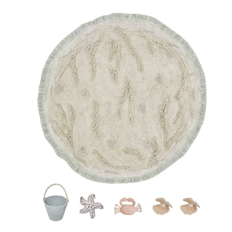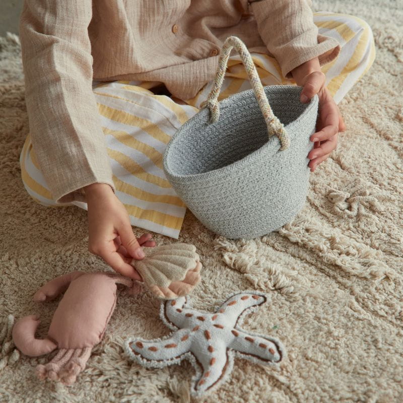 Dzięki połączeniu krótkich i średniej wysokości runa w nieregularny wzór, dywanik Island przywodzi na myśl miękkie wydmy piaszczystej plaży. Otoczony jest krótkimi frędzlami w naturalnym i niebieskim kolorze szałwii reprezentującym brzeg oceanu. Dywanik jest dostarczany z zestawem akcesoriów do zabawy: plecionym koszykiem z niebieskiego sznurka szałwiowego, miękkim krabem, ręcznie haftowaną rozgwiazdą i dwiema muszlami z perłami. Zobacz, jak rozwija się wyobraźnia Twojego dziecka, kiedy buduje zamki z piasku, zbiera muszle i odkrywa wyspę!
