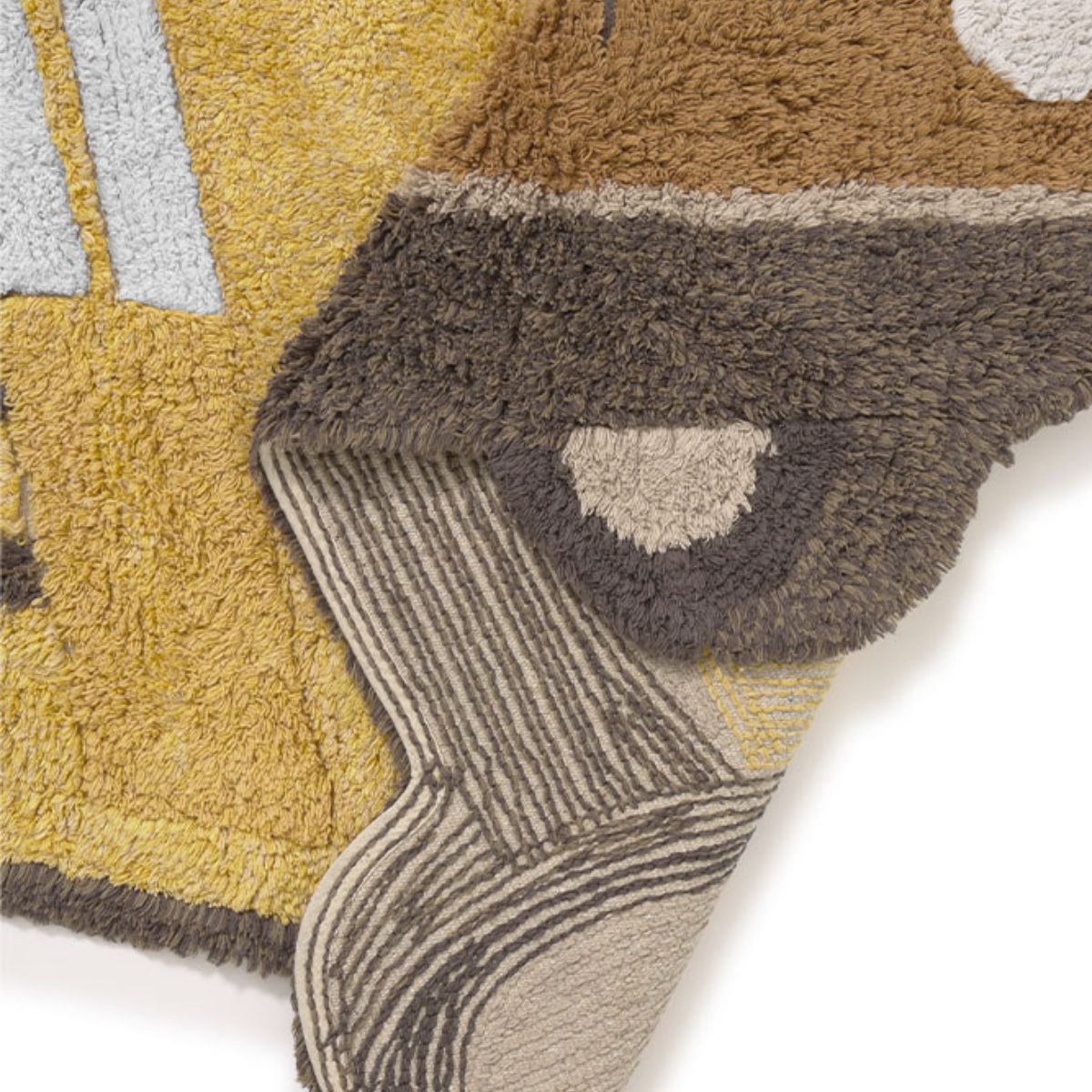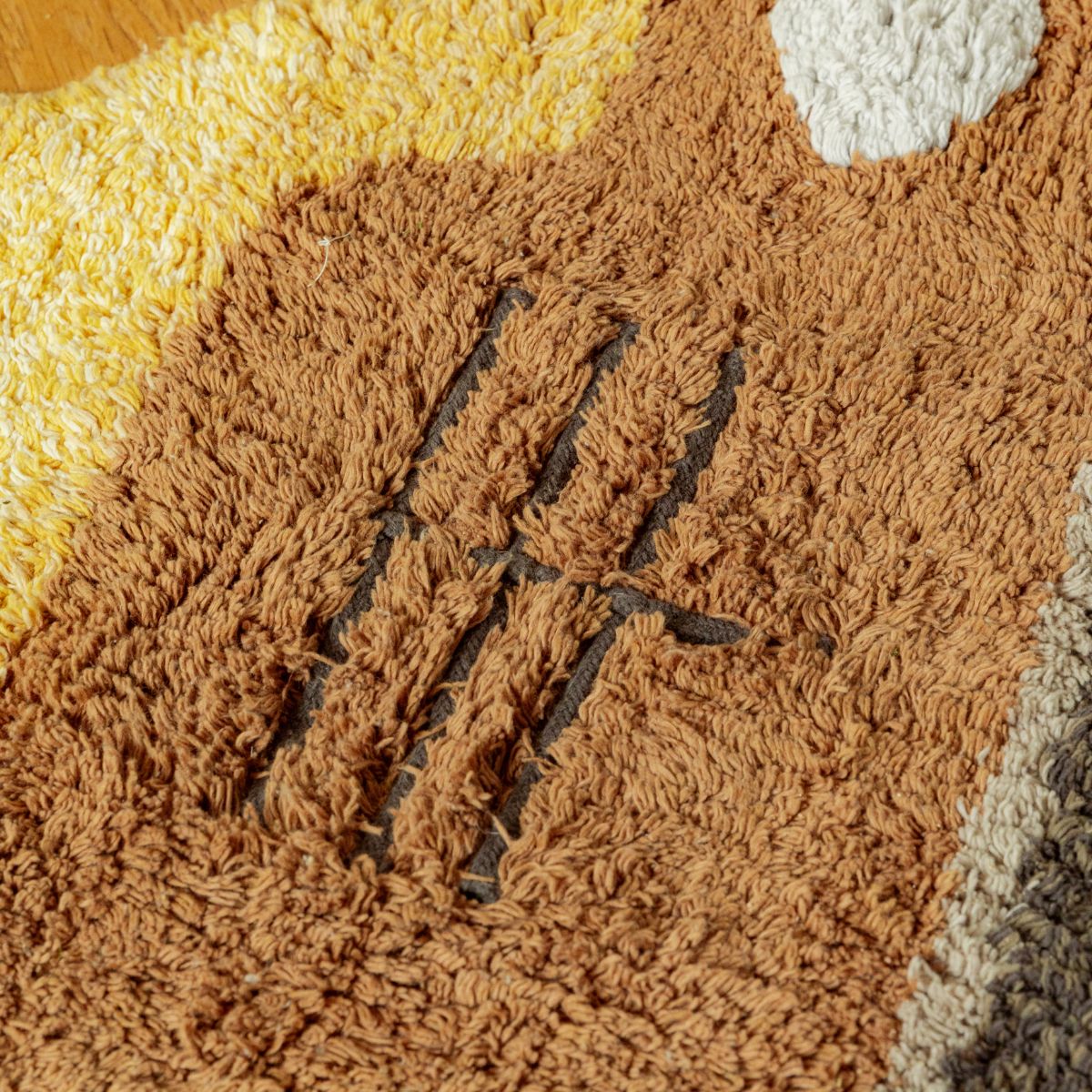 Dywan zachwyca oryginalnym kształtem, który natychmiast przyciąga wzrok, a także misternym wykonaniem. Warstwowa faktura i starannie haftowane kontury nadają mu głębi oraz charakteru, przywodząc na myśl ilustracje z dziecięcych książek. Subtelnie odsłonięte fragmenty płótna wprowadzają element rękodzielniczego uroku, dzięki czemu każdy egzemplarz jest nieco inny i absolutnie wyjątkowy.