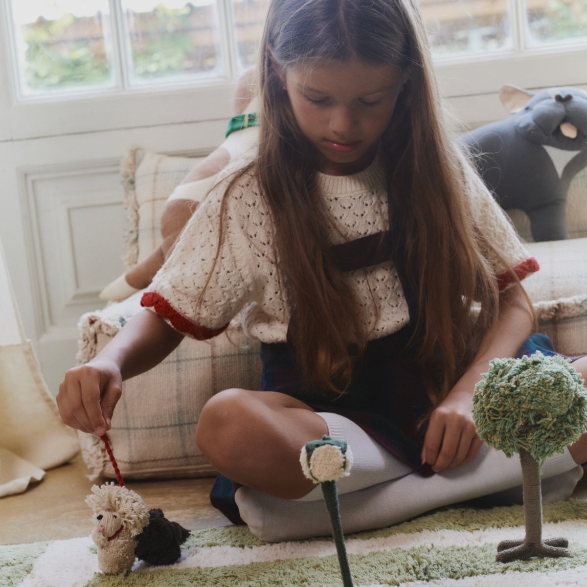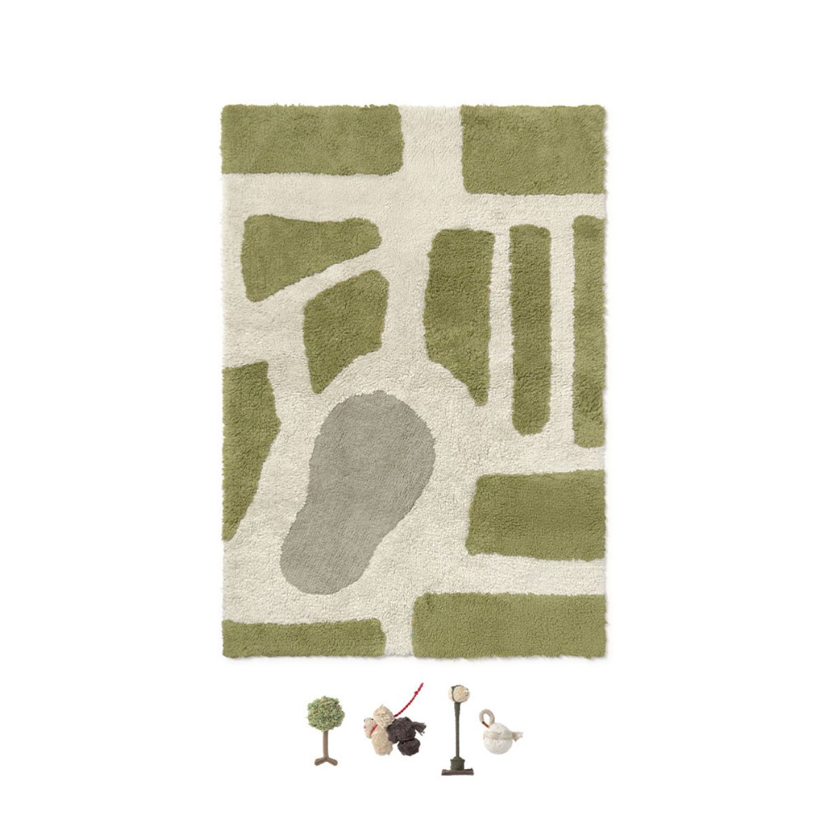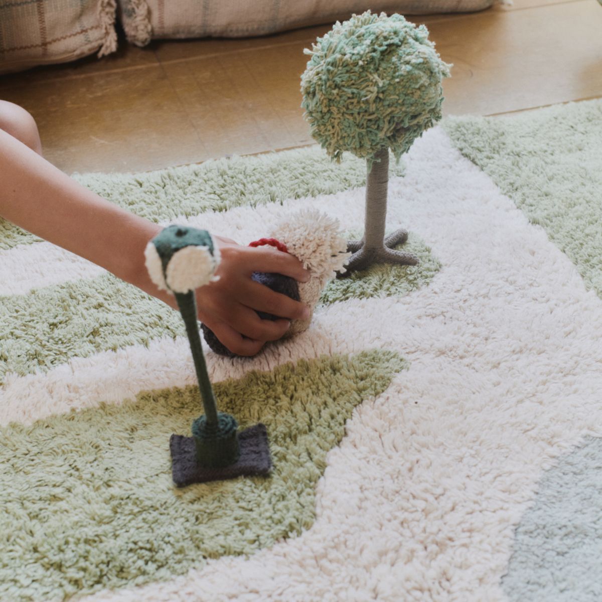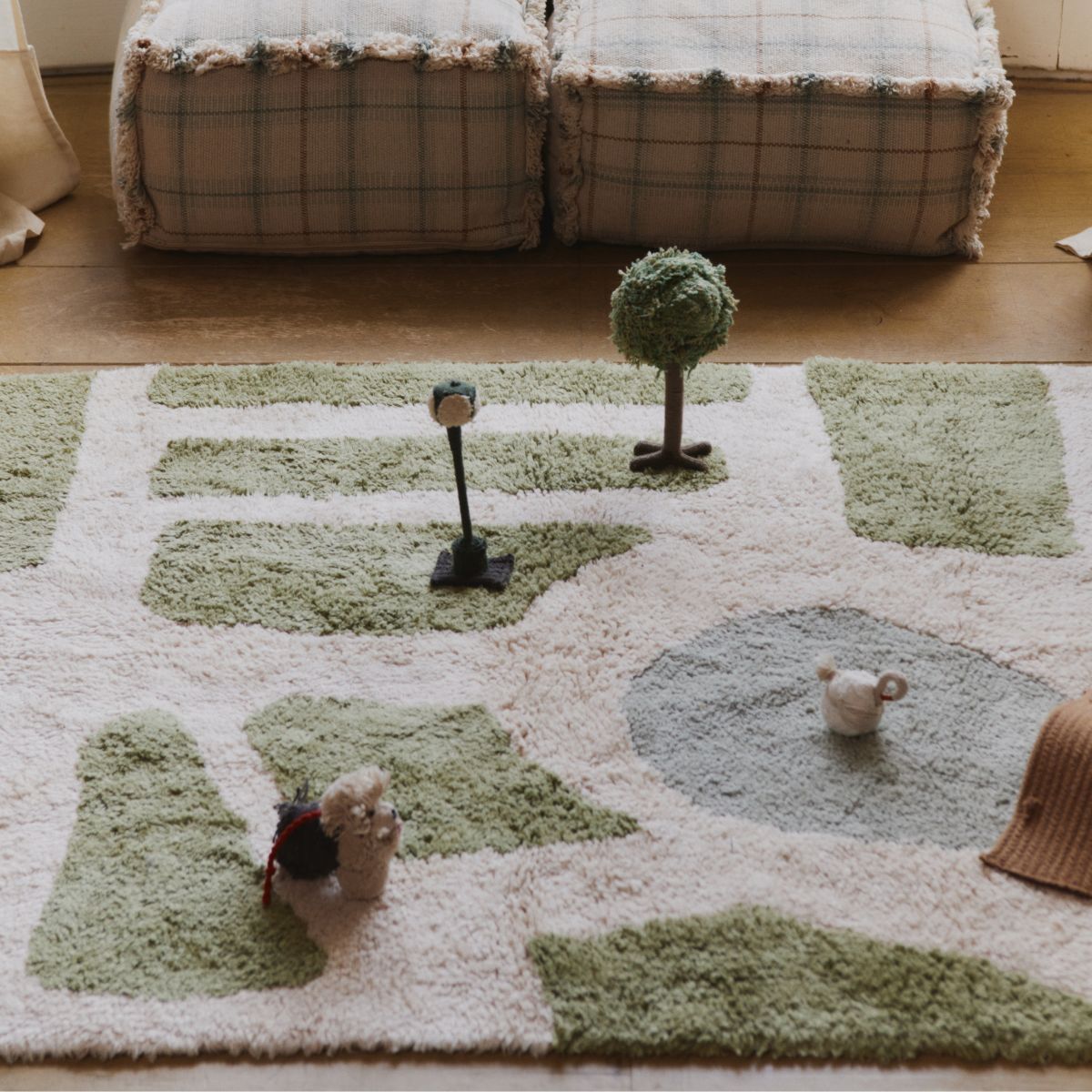 Do dywanu dołączony jest zestaw pięciu ręcznie wykonanych akcesoriów: drzewo, latarnia, mostek, pies i łabędź – wszystkie starannie zapakowane w praktyczny, bawełniany worek. Dzięki detalom ze sznurków bawełnianych, bambusa i ręcznie przycinanych dodatków sceneria Hyde Parku ożywa, zachęcając dzieci do twórczej zabawy.