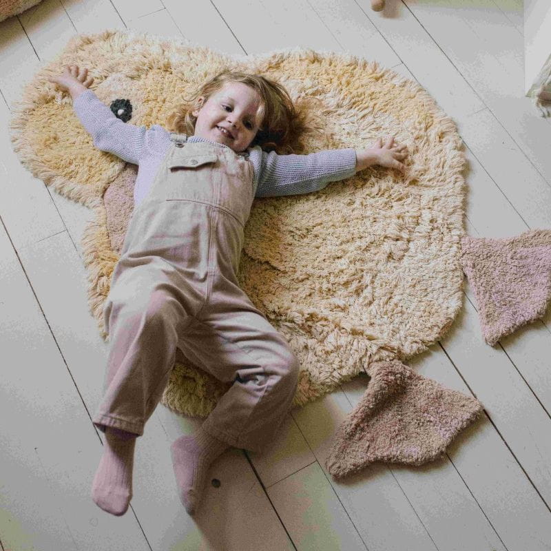Dywan Kaczuszka do pokoju dziecka stworzy wyjątkowy klimat we wnętrzu Twojej pociechy. Subtelne żółte odcienie, w połączeniu z różnorodną długością włosia, tworzą efekt trójwymiarowości i przypominają zaokrąglony kształt kaczątka. Dywanik Kaczuszka ma także uniesiony różowy dziób i delikatnie falujące nóżki, które dodają mu uroku i dynamiki.