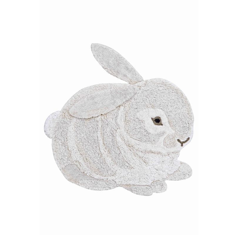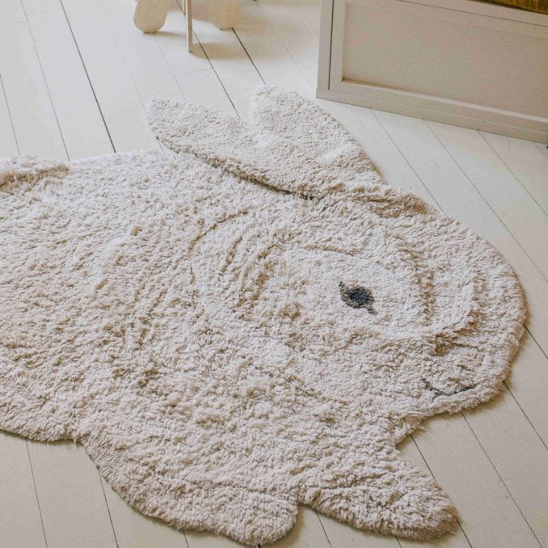Ręcznie wykonany dywan zachwyca naturalną kolorystyką i dopracowanymi detalami. Różne wysokości runa tworzą efekt miękkiego, puszystego futerka, które jest niezwykle przyjemne w dotyku. Długie, ruchome uszy z delikatnej bawełny dodają mu wyjątkowego uroku i zachęcają do zabawy, a puszysty ogonek w odcieniu kości słoniowej dopełnia całości.