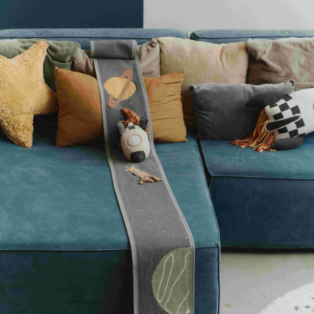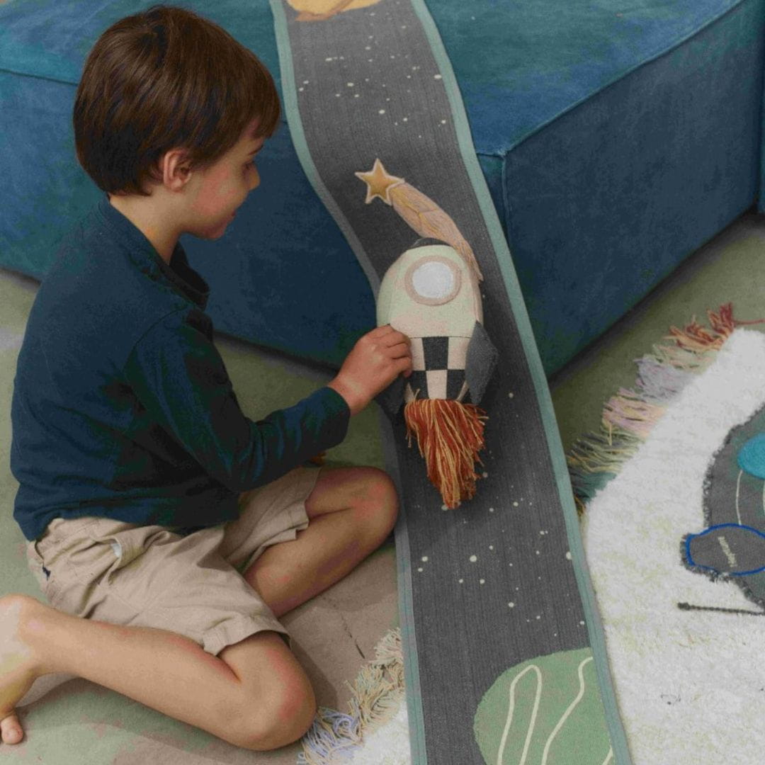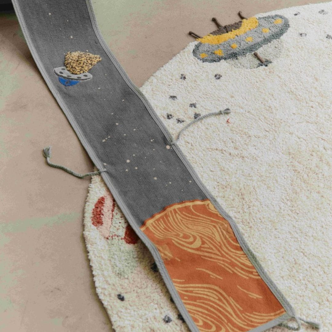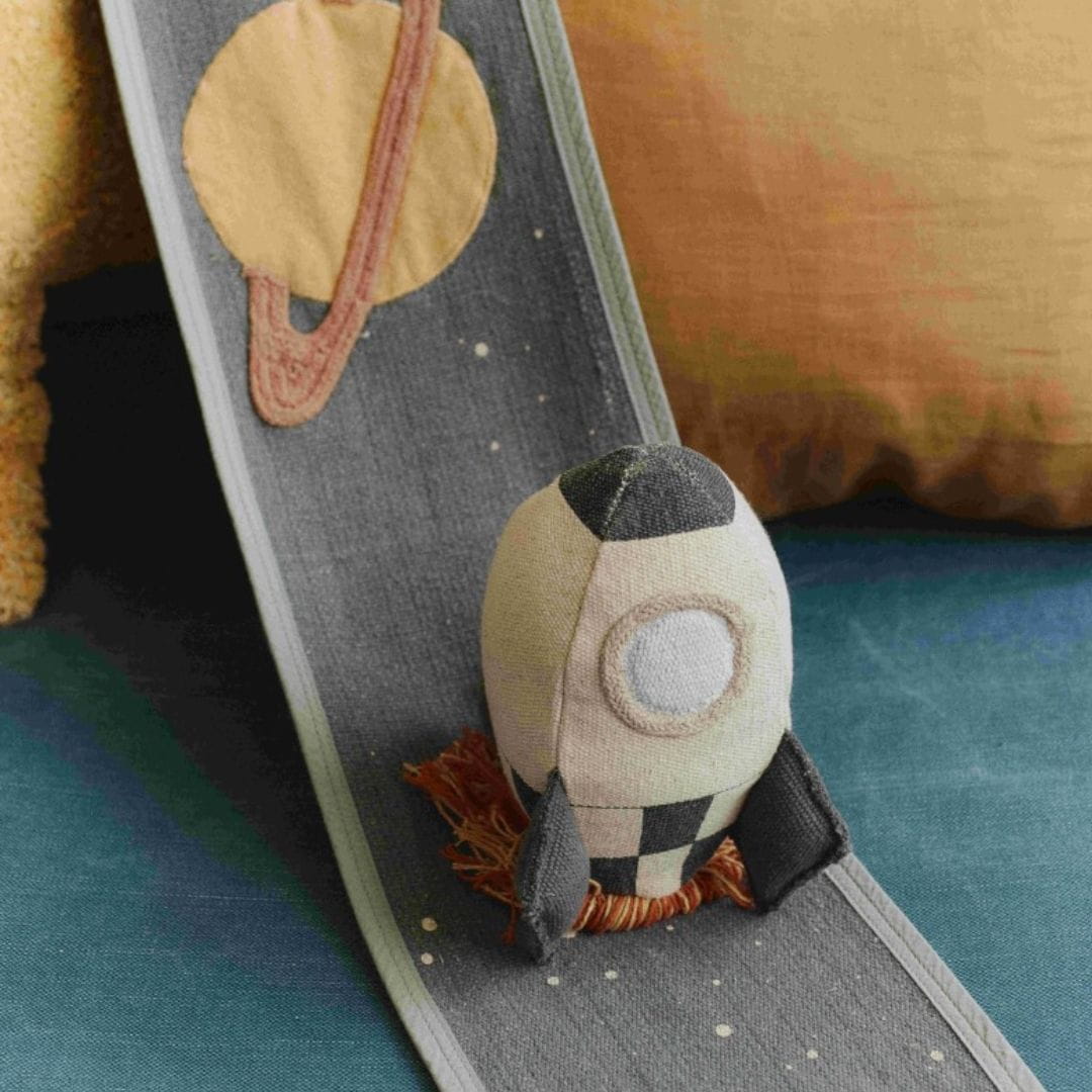 Ta ręcznie wykonana zabawka tekstylna zawiera miękką rakietę wykonaną z naturalnego i ciemnoszarego płótna bawełnianego, z krawędziami z frędzlami, które wyglądają jak płomienie rakiety. Rozwija się z 4-metrowej płóciennej podstawy w kolorach ciemnoszarym i naftowym, prezentując szczegółowe elementy, takie jak kępki planet, naszywki na planety wykonane z płótna, zszywane sznury, płócienne UFO z zabawnymi kępkami świateł i spadającą gwiazdę z kolorowymi serpentynami. Po zwinięciu przekształca się w kompaktowy zestaw z uchwytem do łatwego przenoszenia, gdziekolwiek zaprowadzi Cię przygoda.