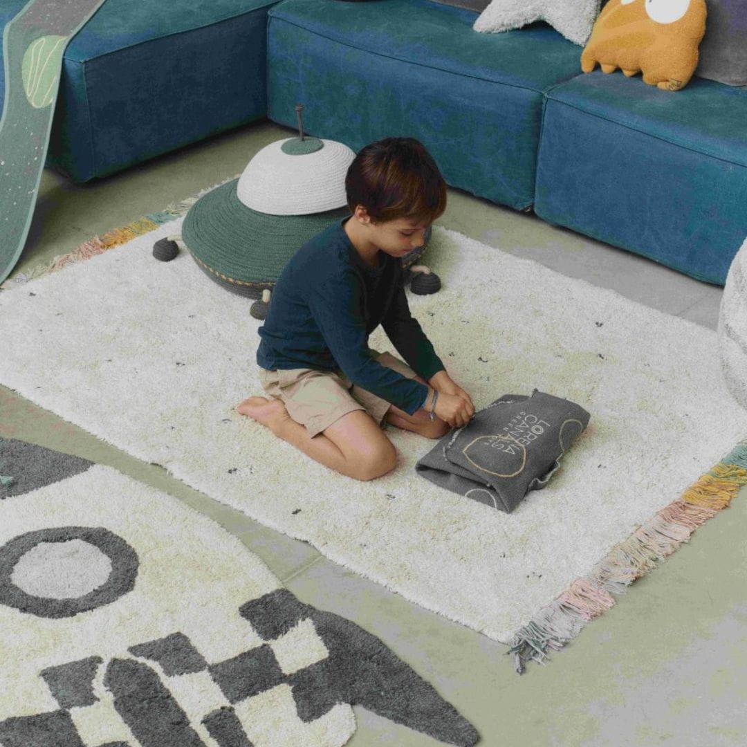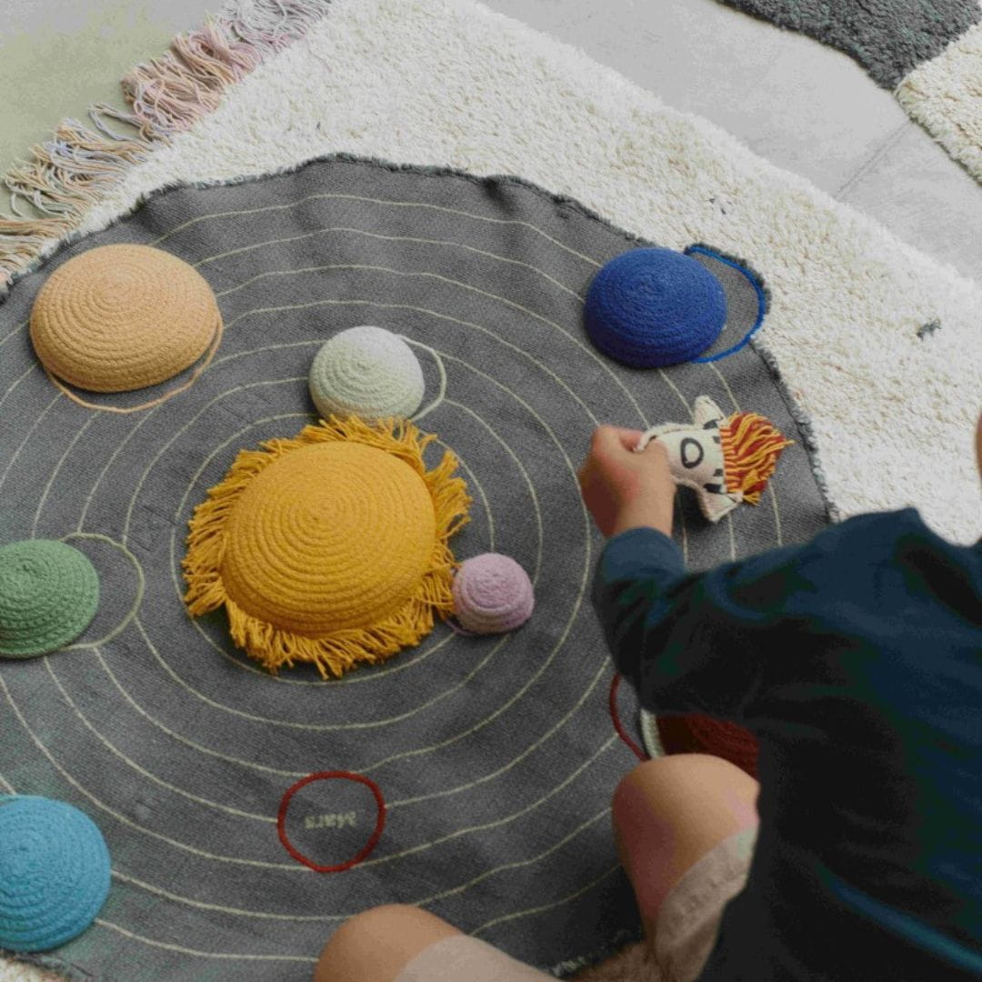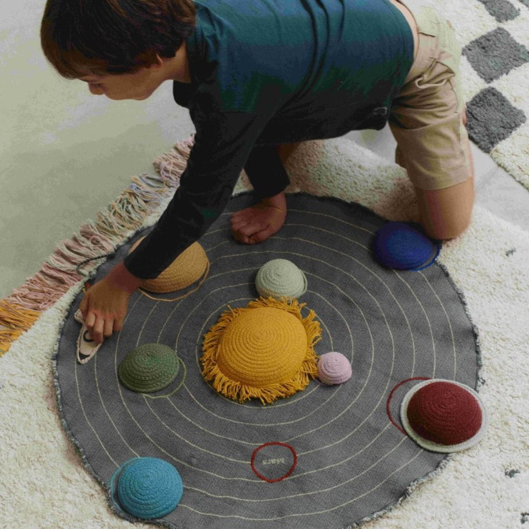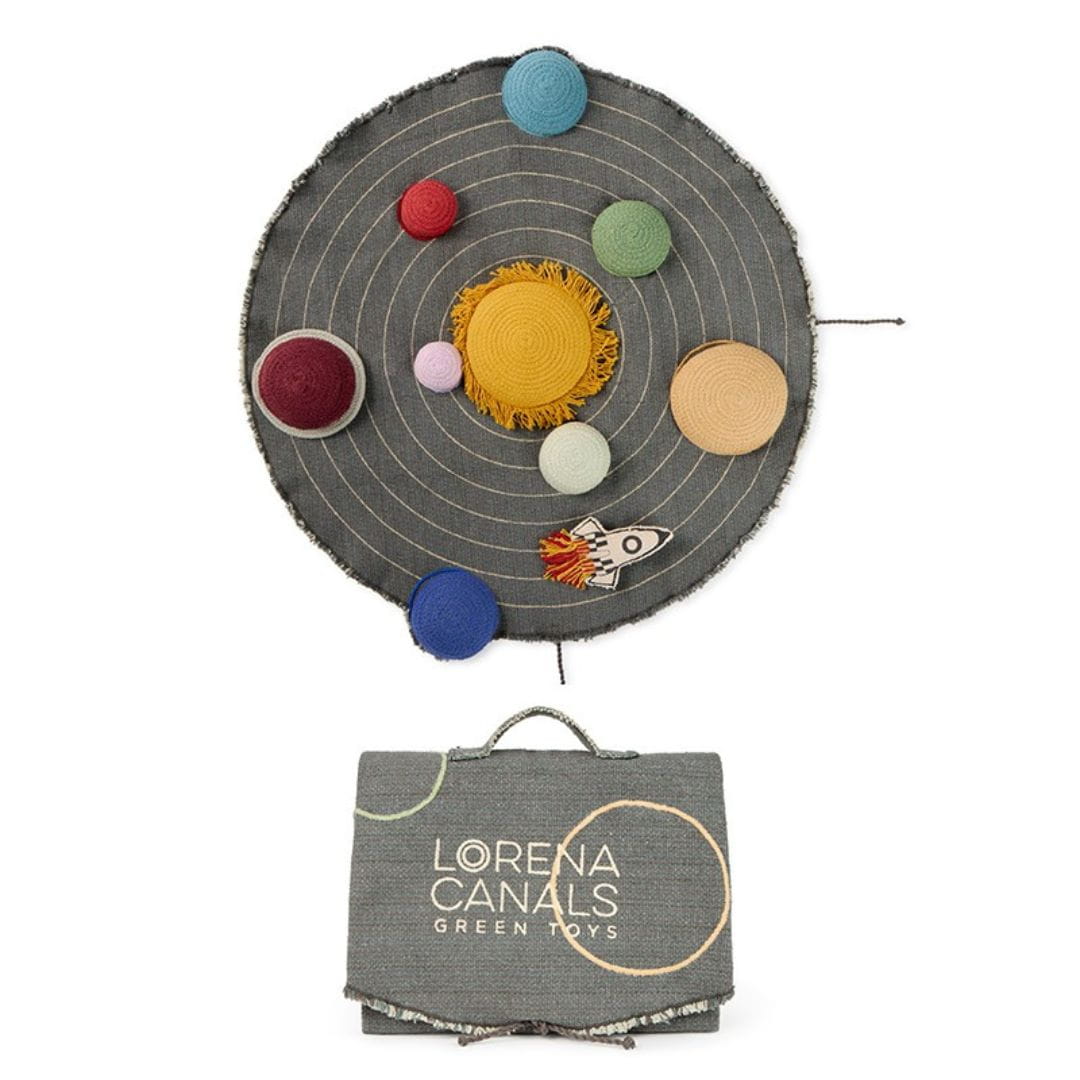 Zestaw zawiera planety z plecionego bawełnianego sznurka, które można umieścić na ich właściwych orbitach oraz mini tekstylną rakietę dla dodatkowej zabawy, gdy dzieci podróżują z jednej planety na drugą. Po zakończeniu zabawy wystarczy umieścić wszystkie elementy wewnątrz, złożyć płótno w walizkę i zabezpieczyć cienkimi sznurkami. Wbudowany uchwyt ułatwia dzieciom przenoszenie przygody z Układem Słonecznym w dowolne miejsce.