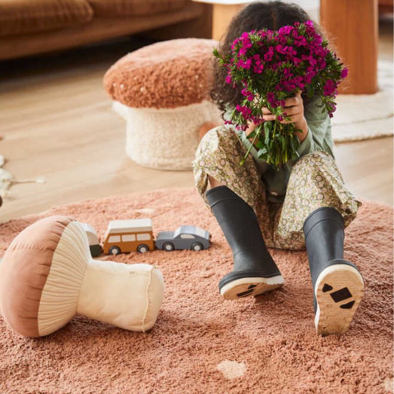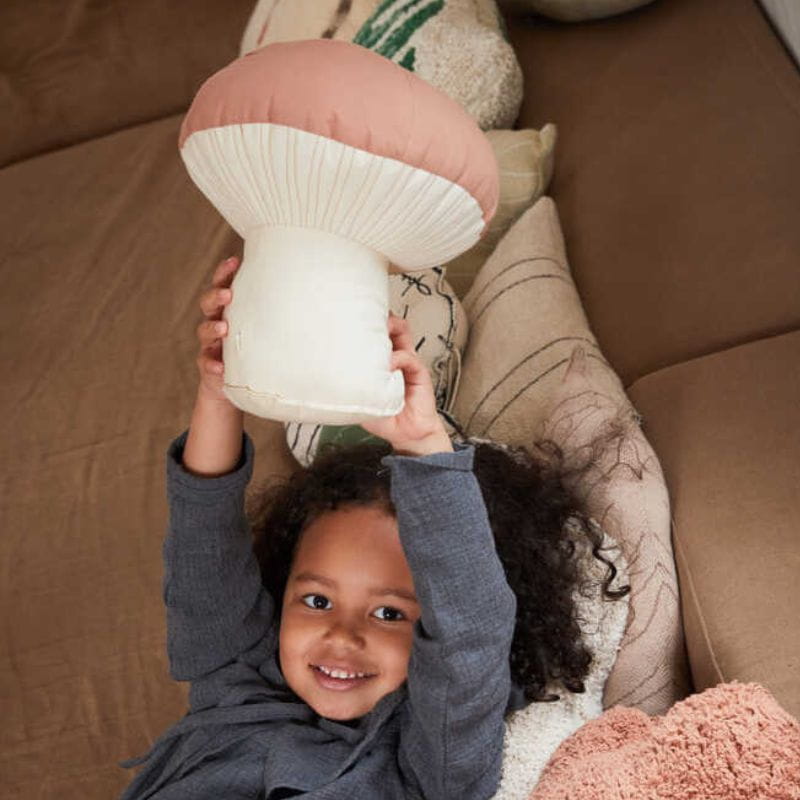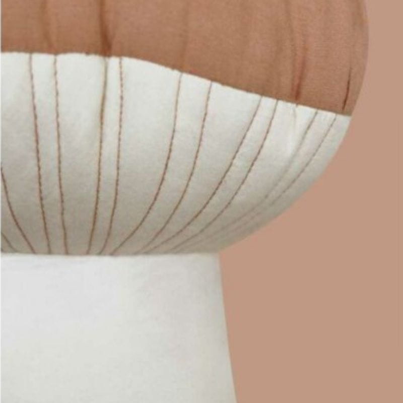 Poduszka w kształcie grzybka jest miękka i przytulna. Wykonana z popeliny z bawełny organicznej, ma kształt grzyba, z haftowanymi detalami, łączącymi delikatne odcienie kolorów naturalnego i kasztanowego. Wypełniona miękkim wypełnieniem.