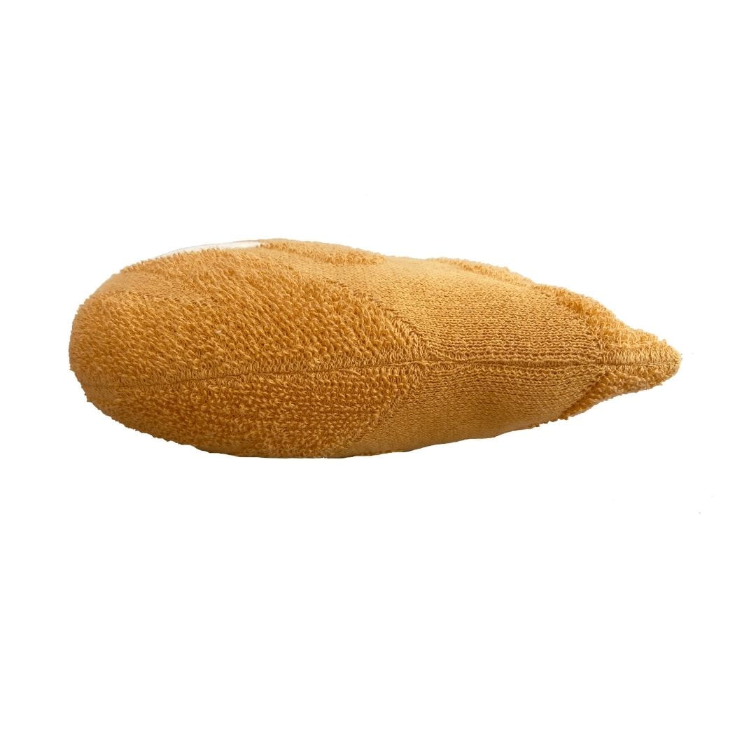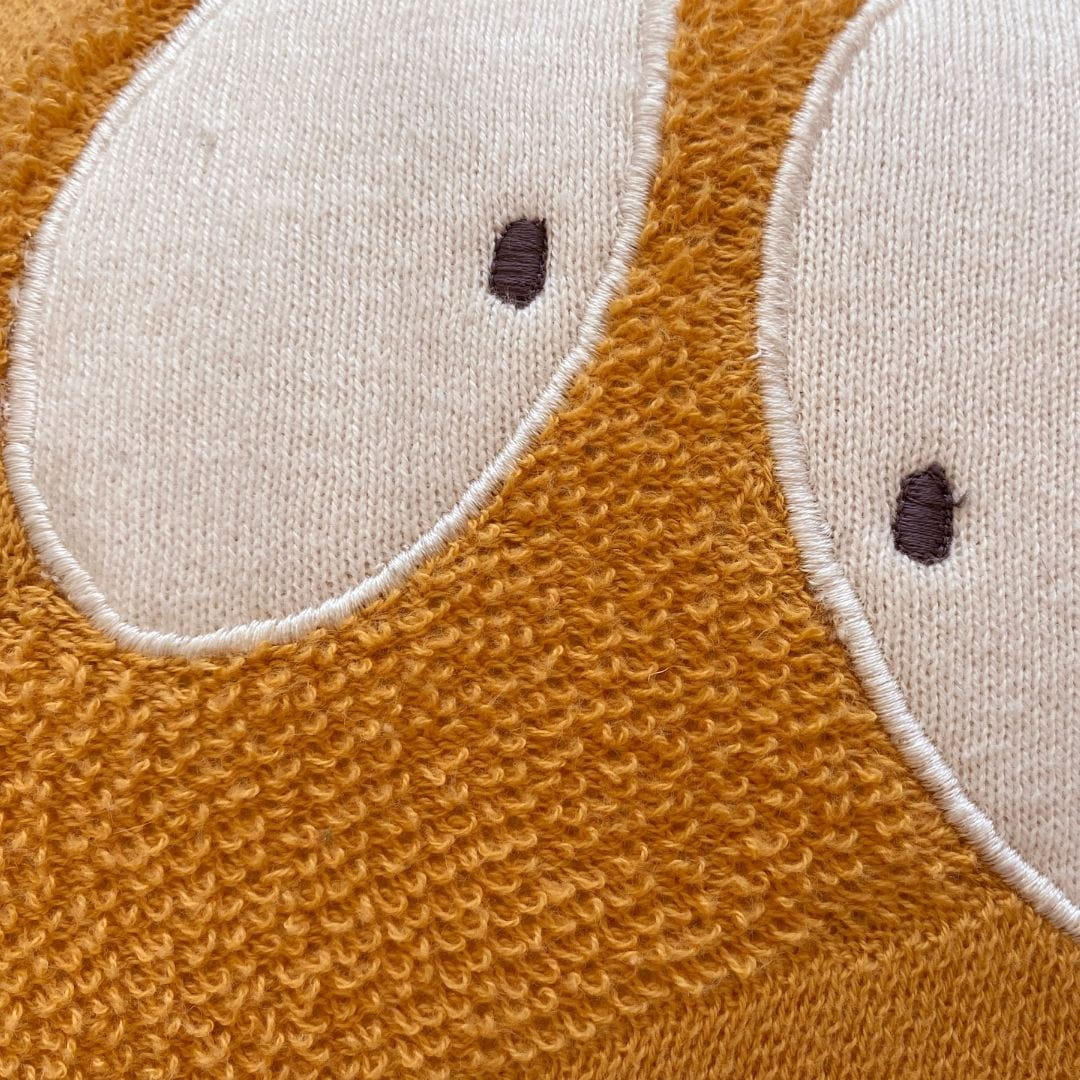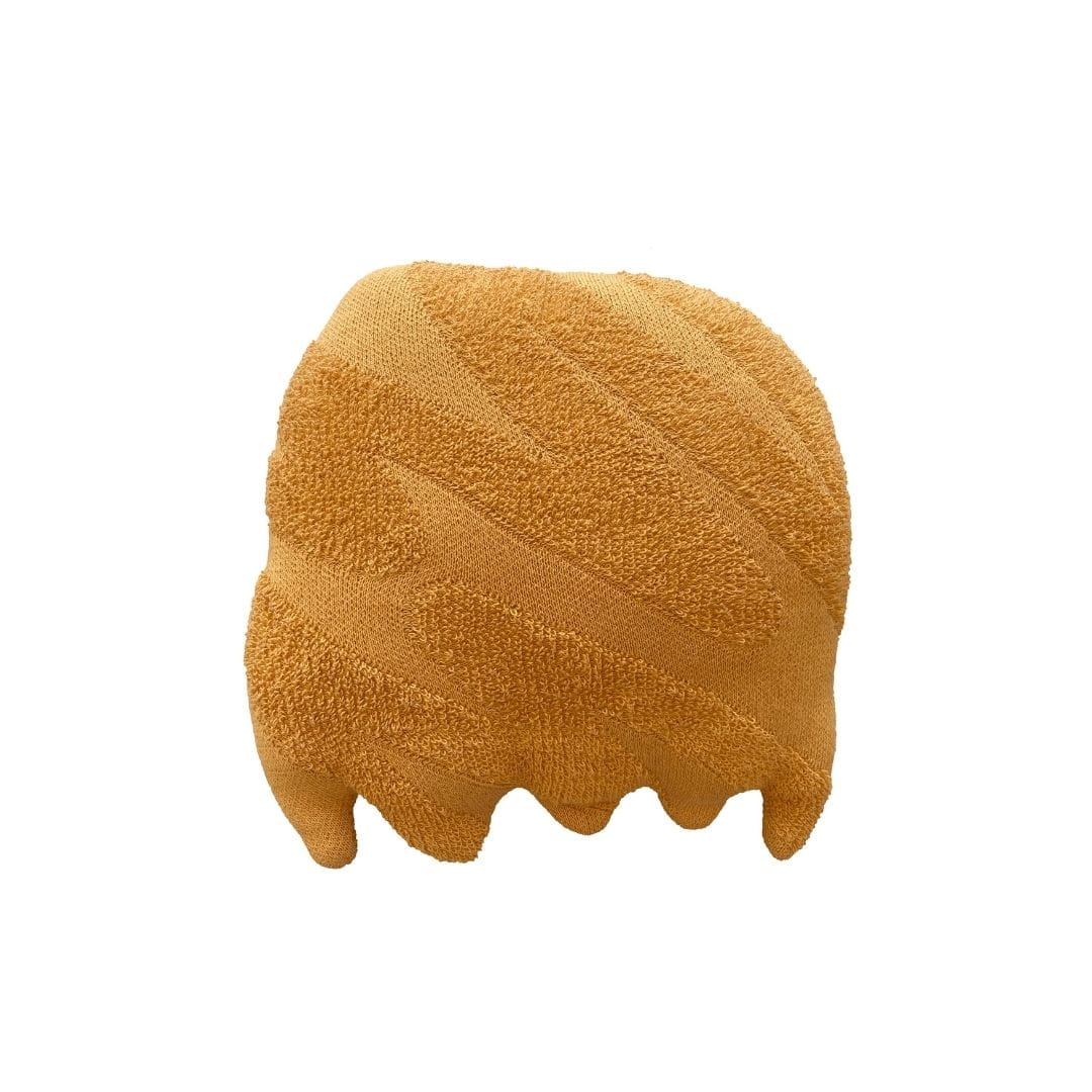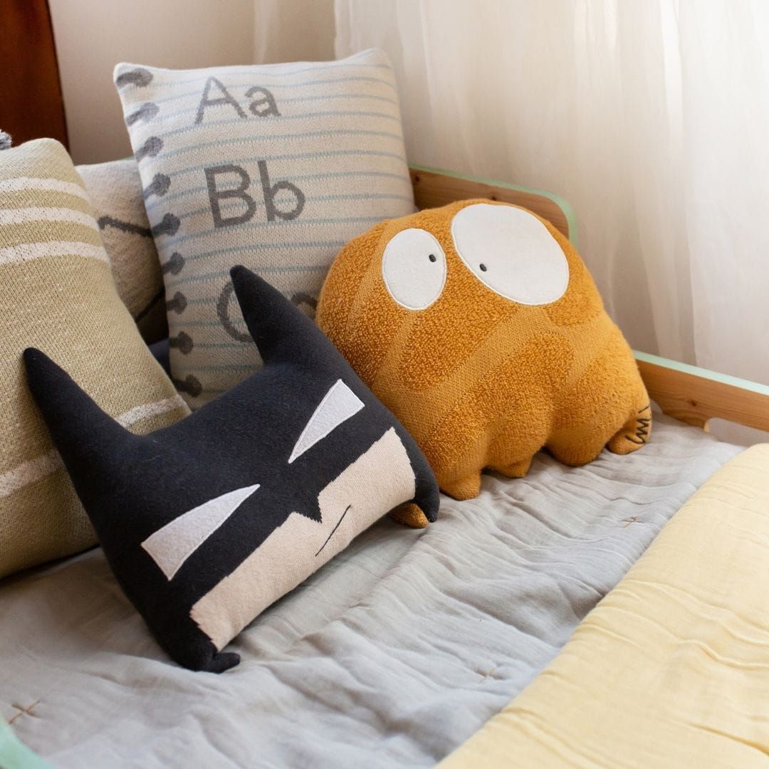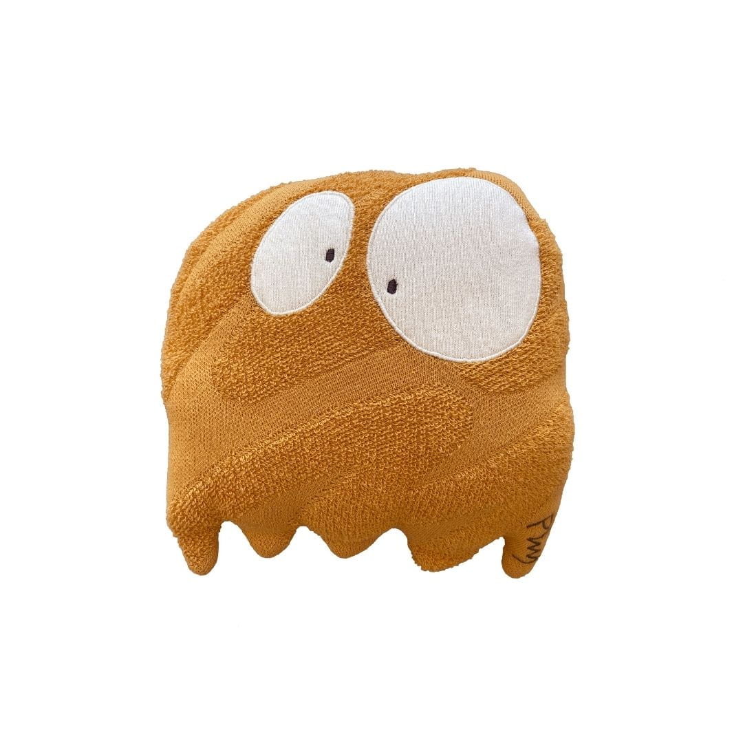 Urocza ozdobna poduszka do pokoju dziecka Ghosty wykonana jest ręcznie z miękkiej bawełny. Zaokrąglona powierzchnia łączy różne techniki dziania, symbolizując pociągnięcia pędzla artysty. Oczy bohatera i podpis artysty są wyszywane ręcznie.