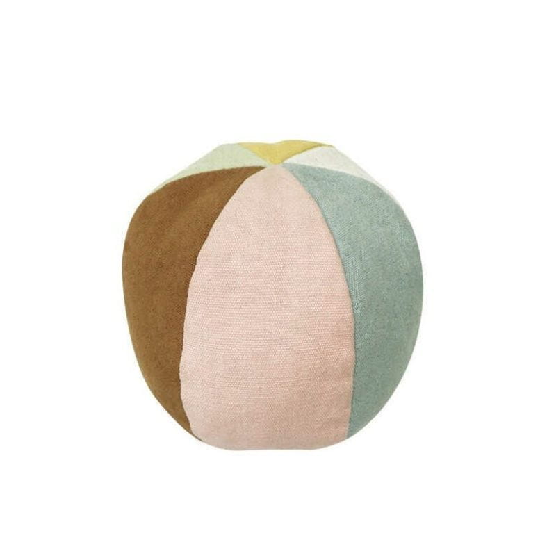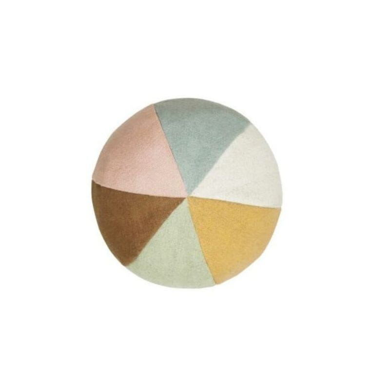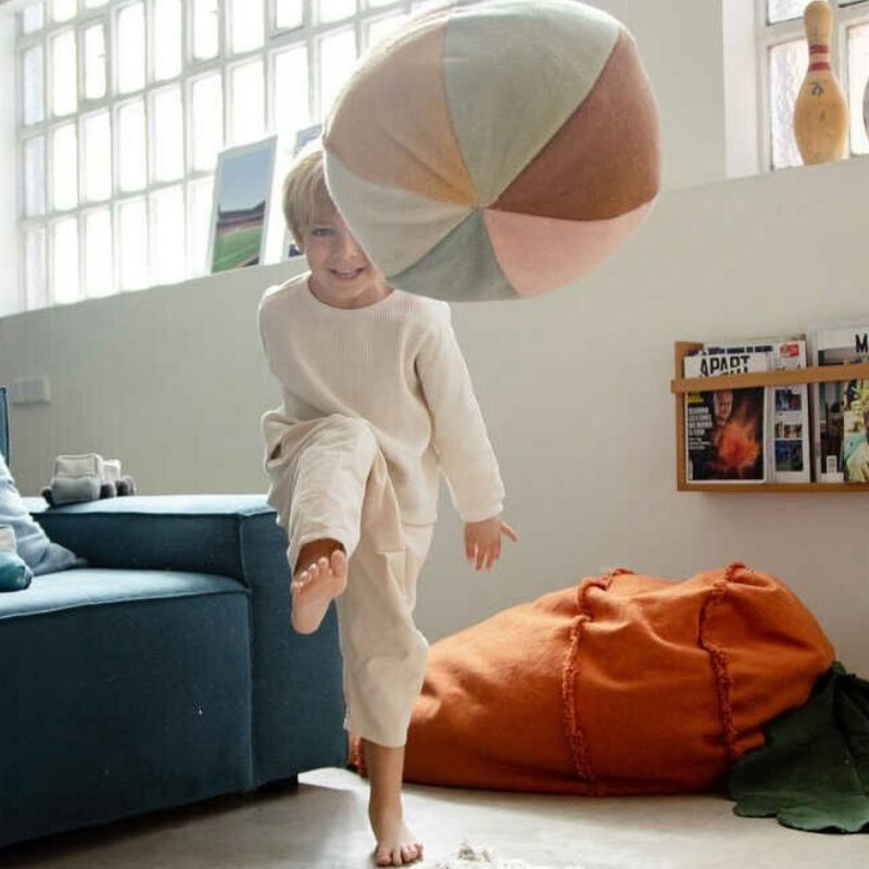 Ta miękka poduszka w kształcie piłki została zaprojektowana jak klasyczna, wielokolorowa piłka plażowa, z paletą dopasowaną do stonowanych odcieni kolekcji Eco-City.