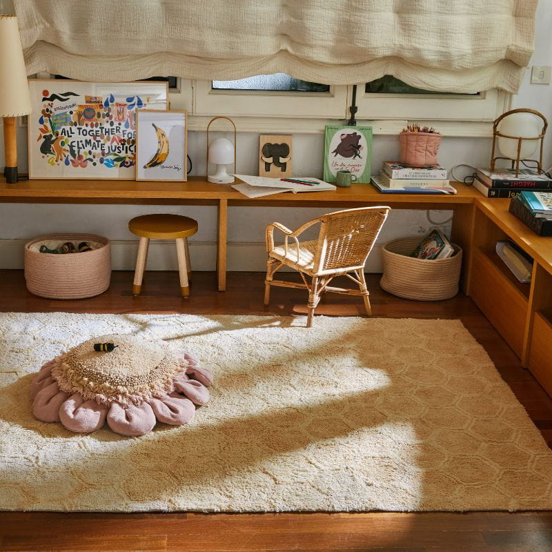 Kolekcja dywanów i dodatków Planet Bee pomaga w tworzeniu przyjaznego środowiska do nauki, promującego uznanie dla pszczół i środowiska w domu.