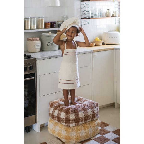 Wygodny rozmiar dziecięcej pufy, dostępny w czterech wersjach kolorystycznych pasujących do dywanów z kolekcji Little Chefs.