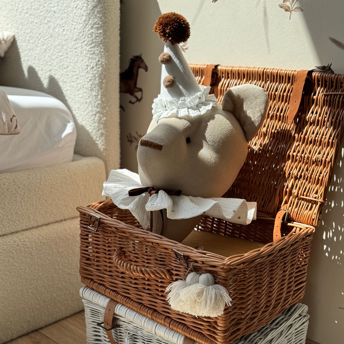 Lniany miś z kołnierzem i czapeczką to idealny dodatek do aranżacji wnętrza dla dzieci. Nada niepowtarzalnego uroku i lekkości każdemu pokoikowi dziecięcemu.