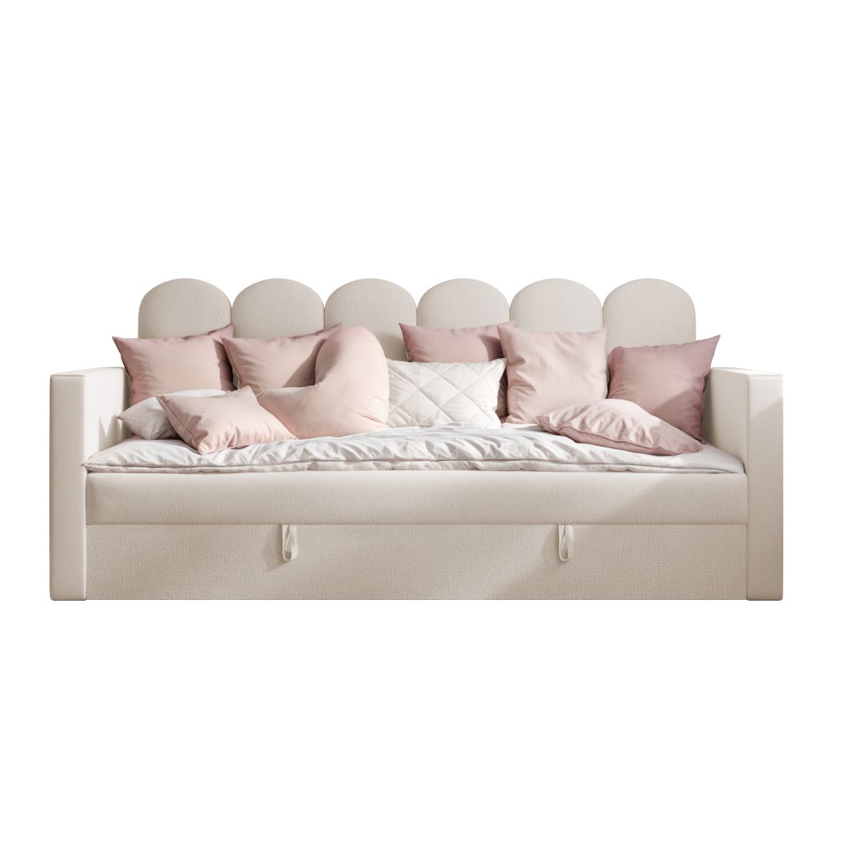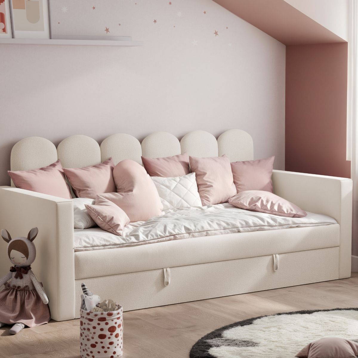 Dzięki swojej uniwersalnej formie łóżko może pełnić również funkcję dziennej sofy – idealnej do relaksu, czytania czy spędzania czasu z przyjaciółmi.