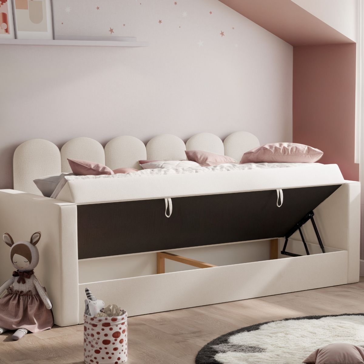 Pod stelażem znajduje się pojemny schowek na pościel, który pomieści kołdry, poduszki, koce oraz inne akcesoria. To praktyczne rozwiązanie pozwala zaoszczędzić miejsce i utrzymać porządek w pokoju.