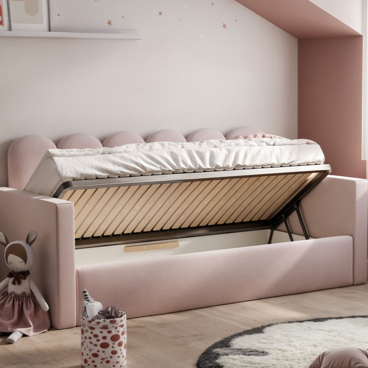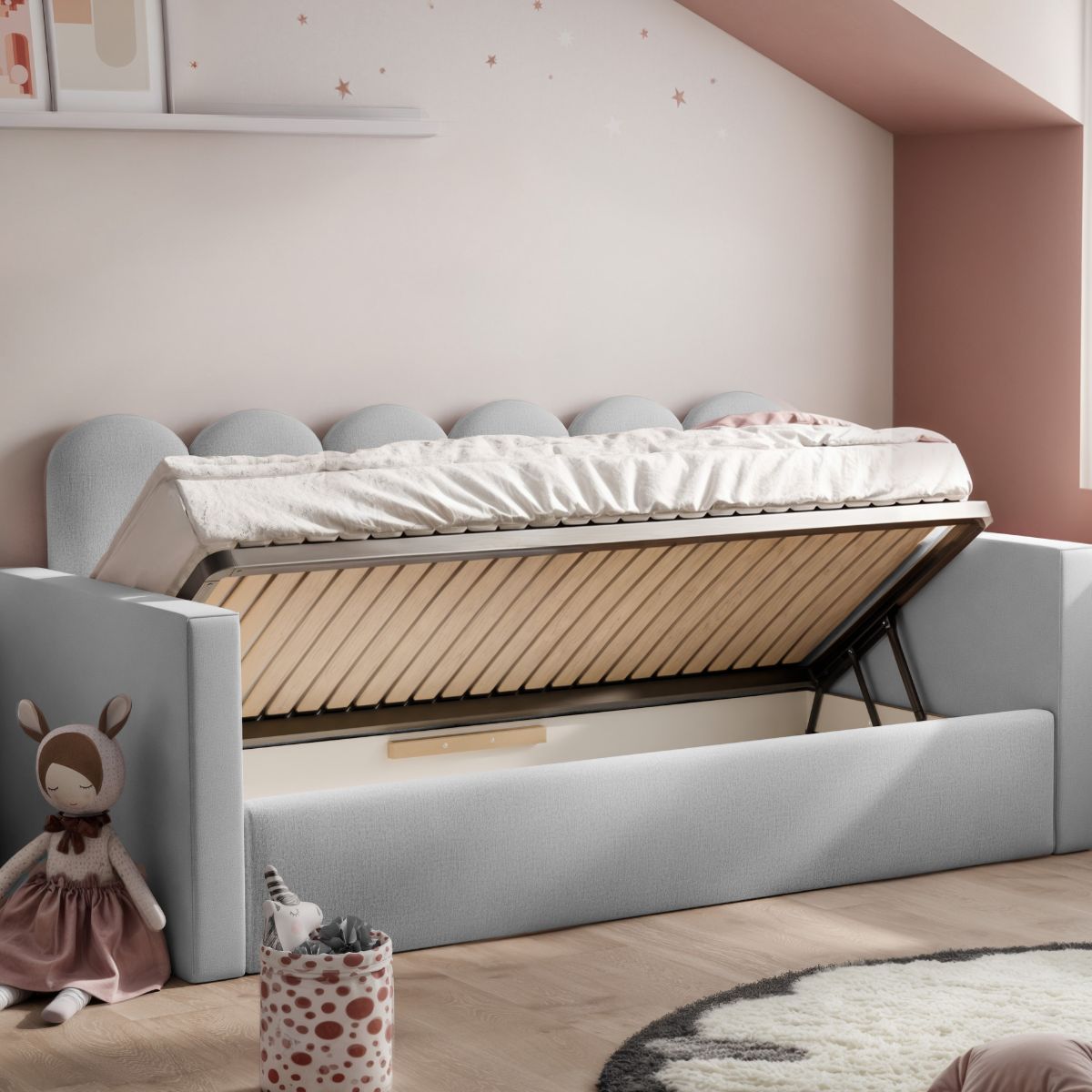 Stylowe i funkcjonalne łóżko tapicerowane do pokoju dziecka wyposażone w solidny stelaż metalowy z funkcją podnoszenia to idealne rozwiązanie. Trwała konstrukcja stelaża zapewnia stabilne podparcie dla materaca, co przekłada się na wysoki komfort snu oraz odpowiednią wentylację materaca, wydłużając jego żywotność.