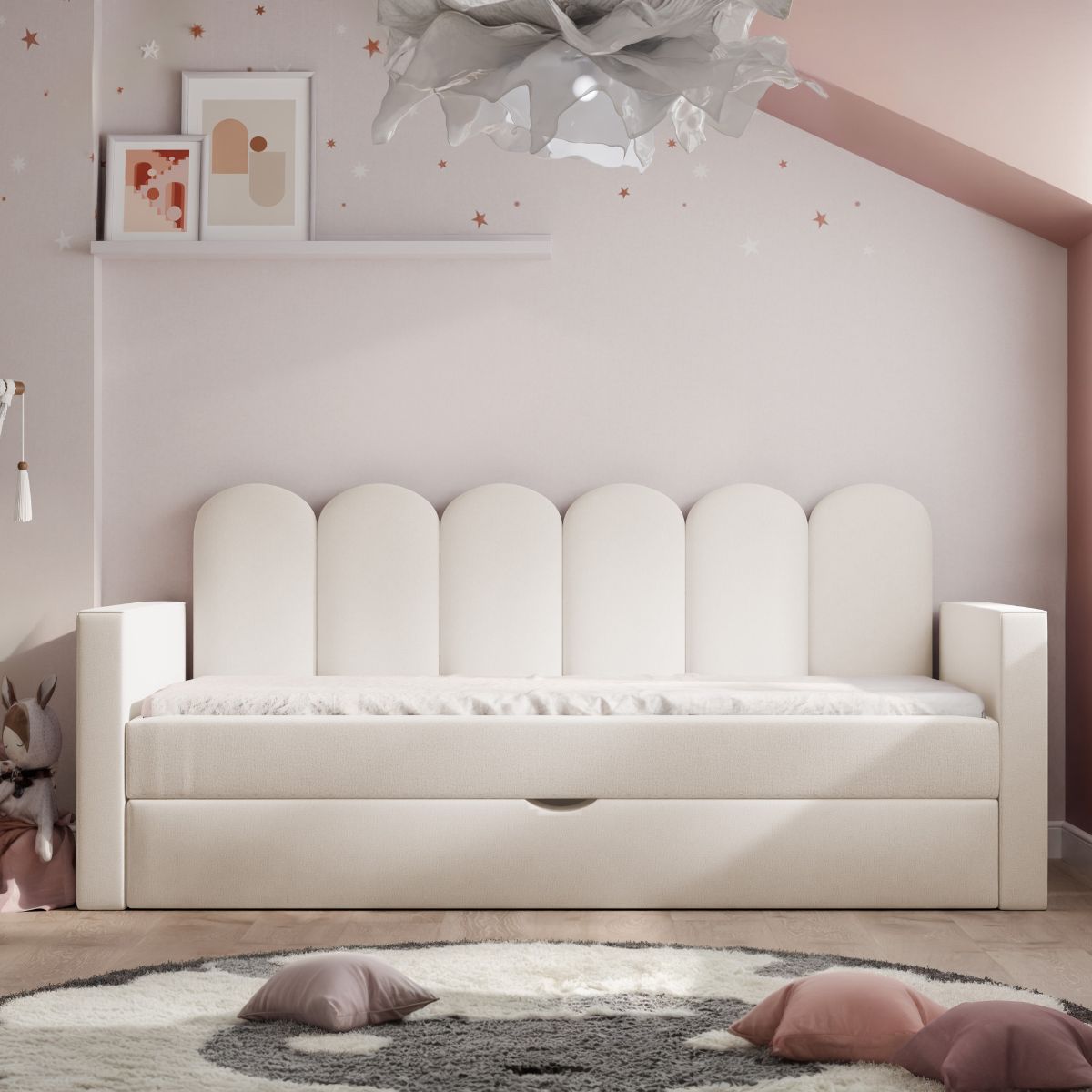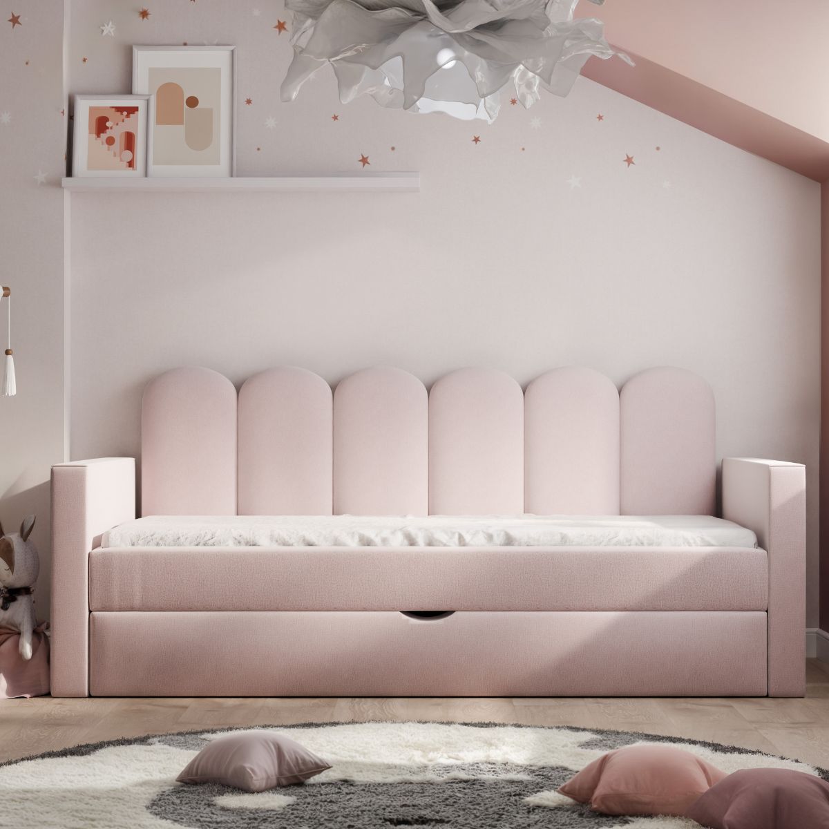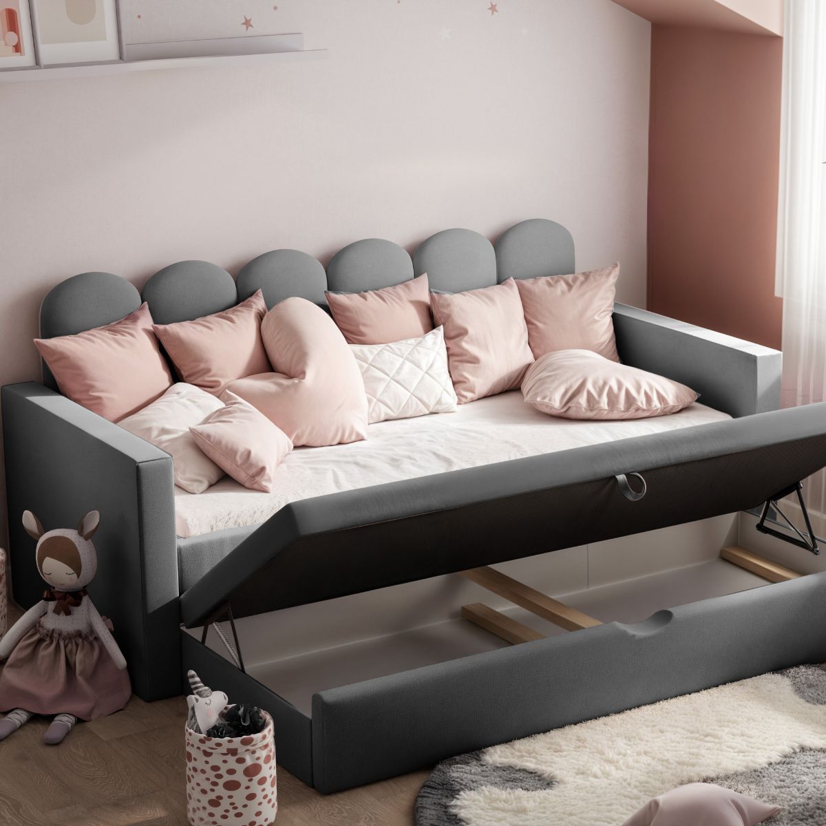 ŁÓŻKO TAPICEROWANE DLA DZIECKA ALIA Z DODATKOWĄ POWIERZCHNIĄ DO SPANIA