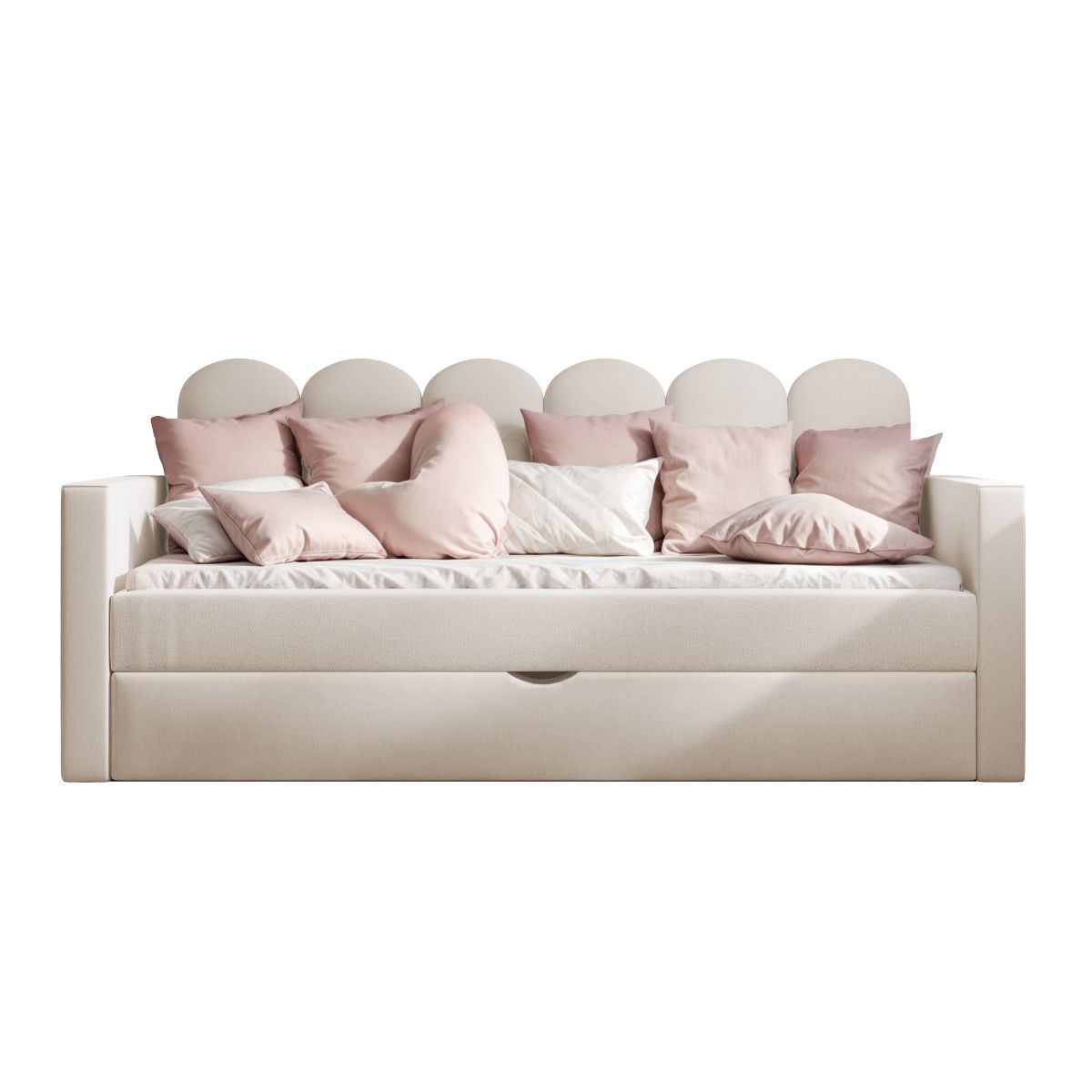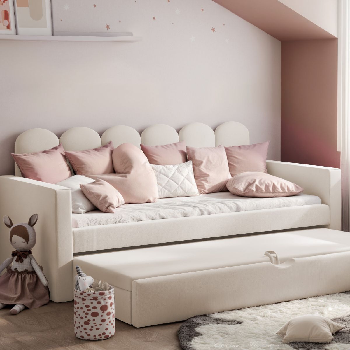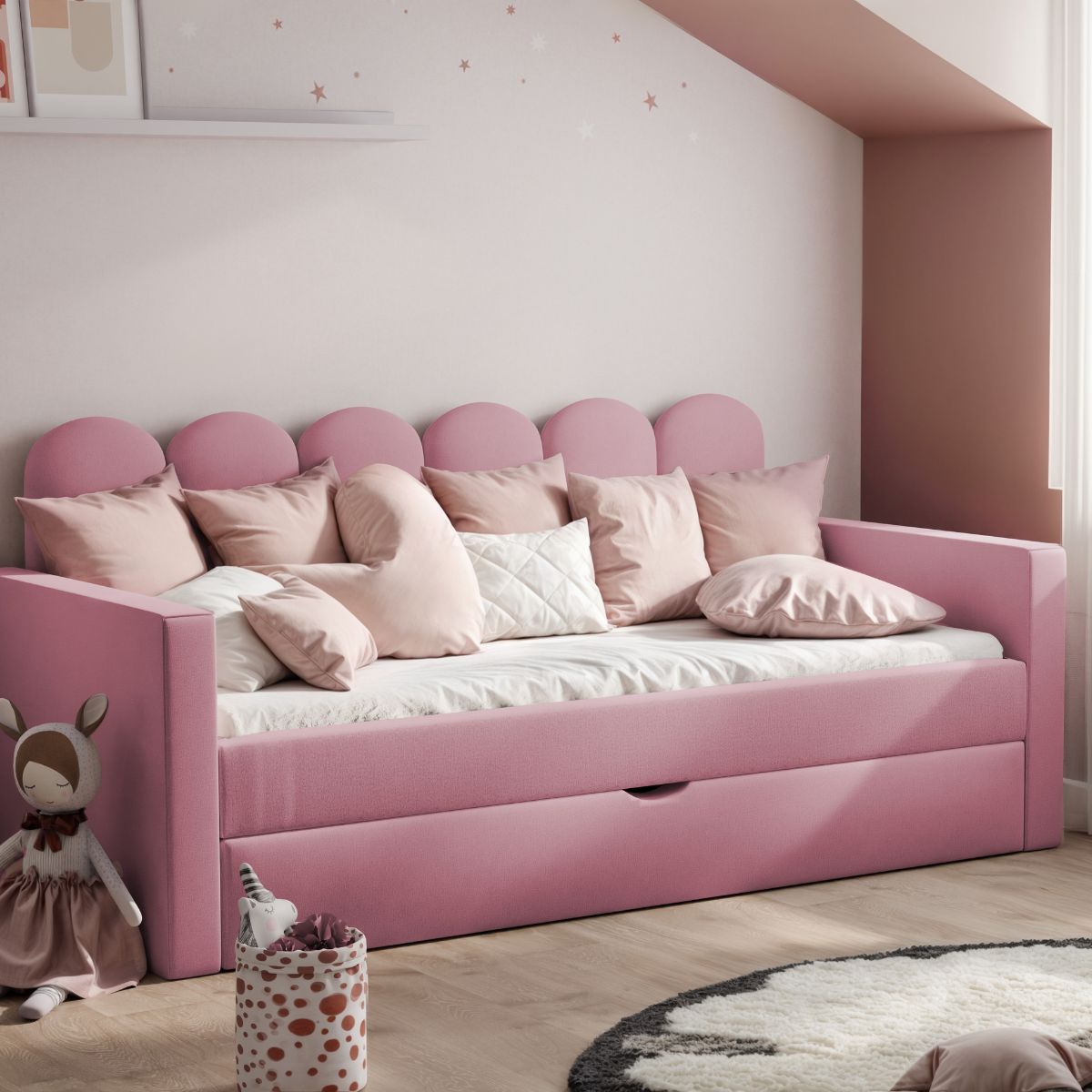 ŁÓŻKO TAPICEROWANE DLA DZIECKA ALIA Z DODATKOWĄ POWIERZCHNIĄ DO SPANIA