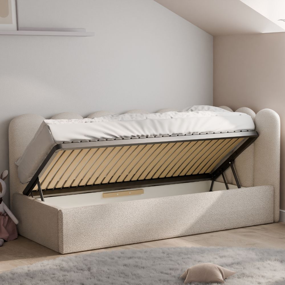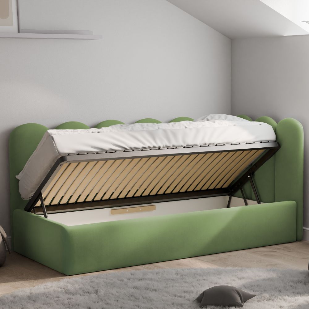 ŁÓŻKO TAPICEROWANE DLA DZIECKA ELSA Z PODNOSZONYM STELAŻEM I POJEMNIKIEM