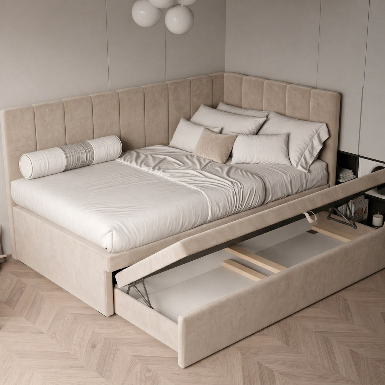 W Tuliroom wiemy, że w pokoju dziecka każdy centymetr jest na wagę złota. Dlatego pod dodatkową powierzchnią spania ukryliśmy przestronny schowek, który stanie się Twoim najlepszym sprzymierzeńcem w walce o porządek.