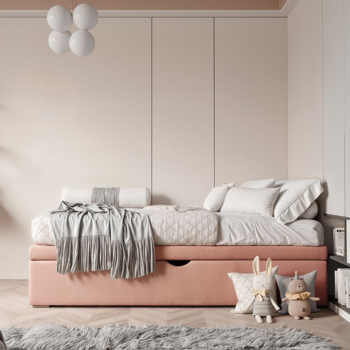 Funkcjonalność i styl w jednym! Tapicerowane łóżko posiada pojemną szufladę, która jest idealnym rozwiązaniem do przechowywania pościeli, zabawek czy ubrań. Pomaga utrzymać porządek w pokoju dziecka, oszczędzając cenną przestrzeń.