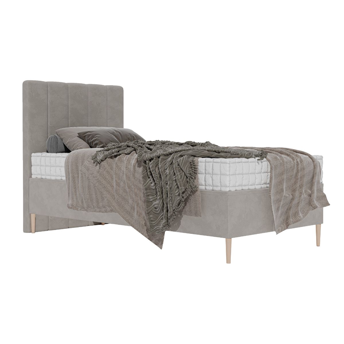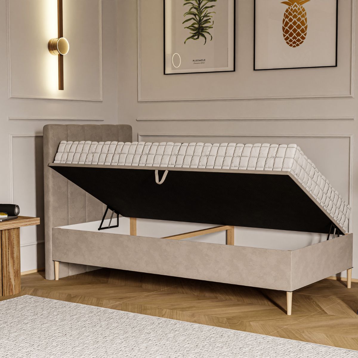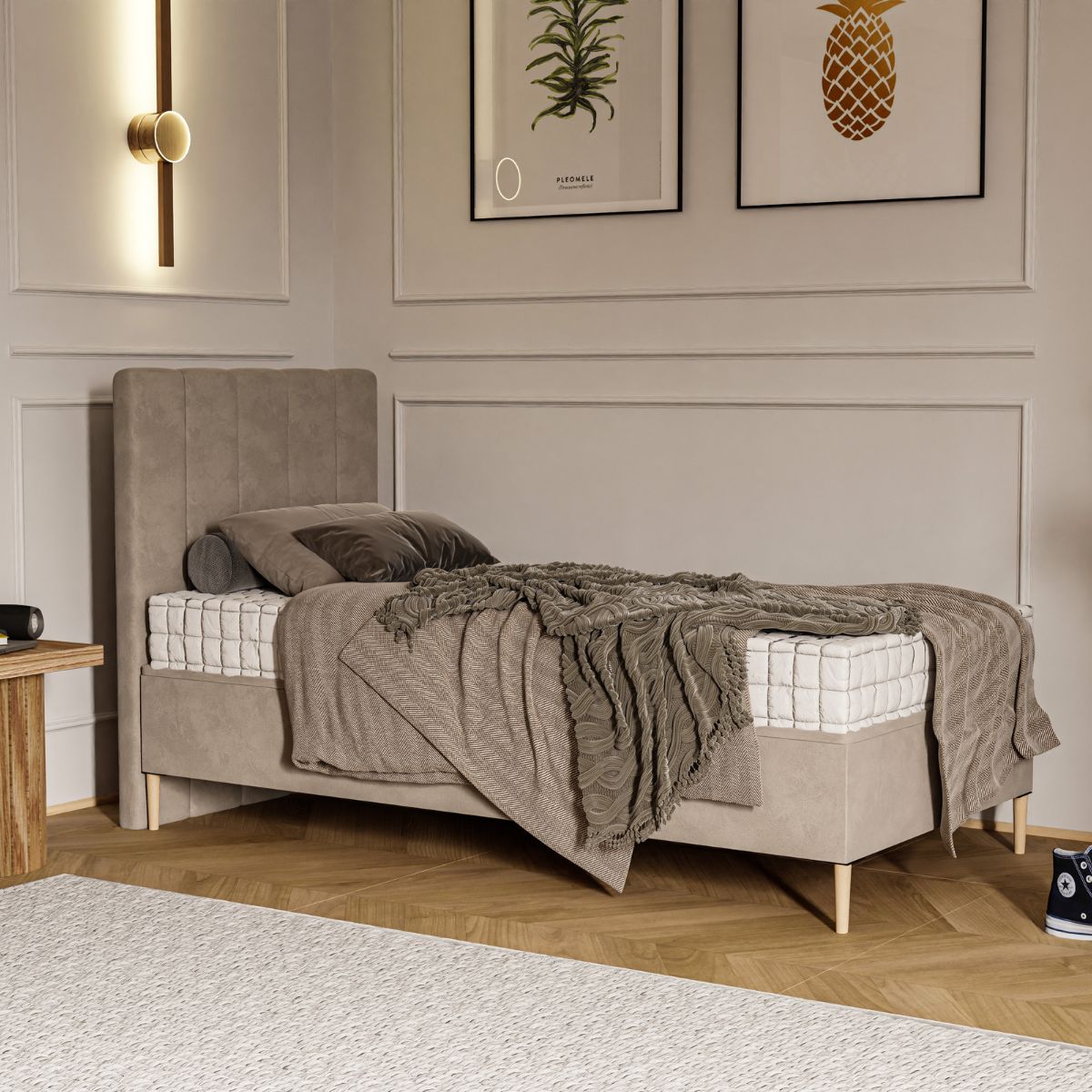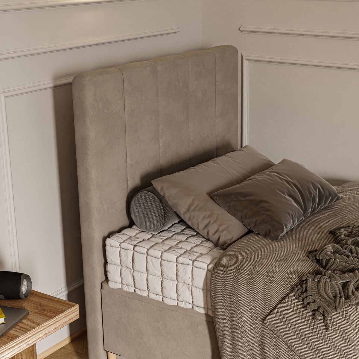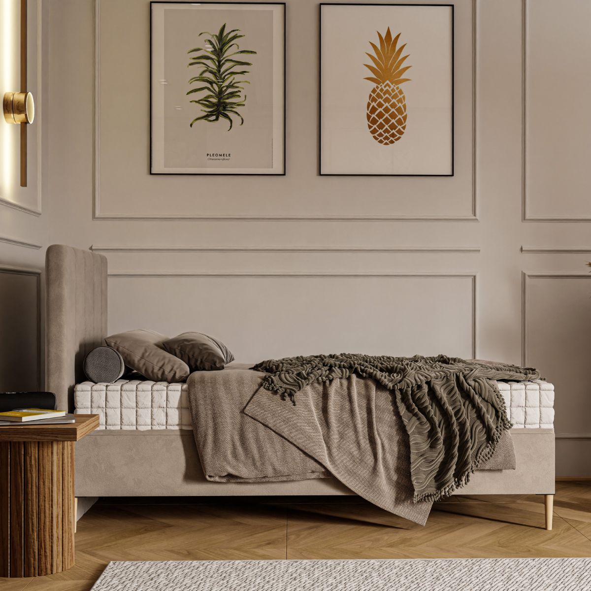 Miękkie, tapicerowane wezgłowie na krótkim boku zapewnia wygodne oparcie, a jednocześnie dodaje łóżku lekkości i stylu. Całość dopełniają wysokie nogi o wysokości 15 cm, które ułatwiają sprzątanie pod łóżkiem oraz nadają konstrukcji nowoczesny wygląd.
