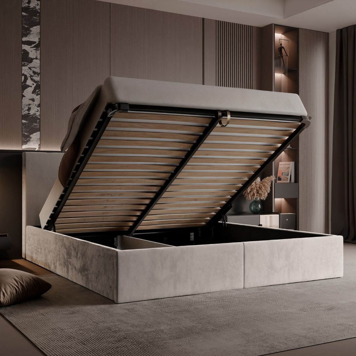 Łóżko tapicerowane młodzieżowe dostępne jest w dwóch wersjach stelaża, dzięki czemu można dopasować je do własnych potrzeb. Pierwsza opcja to stelaż drewniany – solidne, elastyczne listy sprężynujące, zapewniające odpowiednie podparcie dla materaca. Druga wersja to rama metalowa z listwami drewnianymi, wyposażona w podnoszony mechanizm z siłownikiem gazowym 1000N, który umożliwia łatwy dostęp do przestrzeni pod łóżkiem. Obie konstrukcje gwarantują stabilność, trwałość i komfort użytkowania na co dzień.