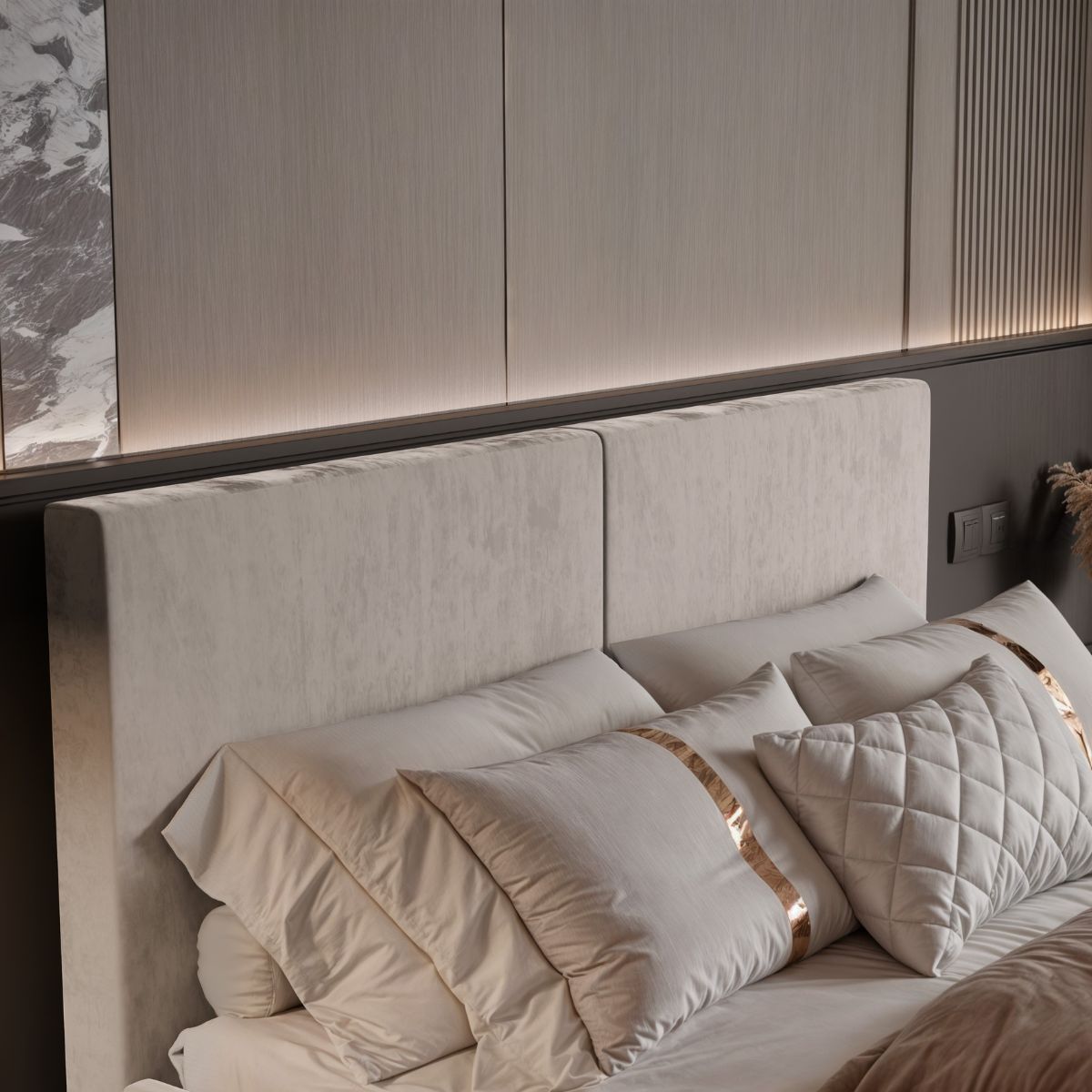 Charakterystyczne pionowe przeszycia zdobiące wysoki zagłówek oraz front ramy dodają meblowi wyjątkowego charakteru i lekkości wizualnej. Dzięki nim łóżko nabiera głębi, stając się stylowym elementem wystroju, który podkreśla indywidualny charakter pomieszczenia.