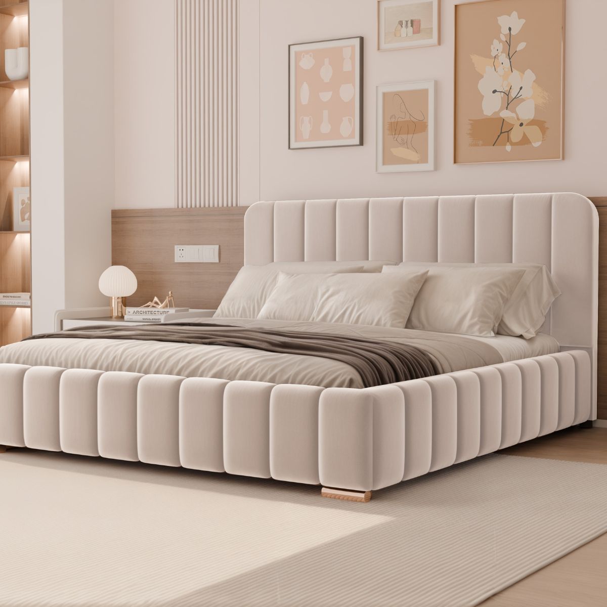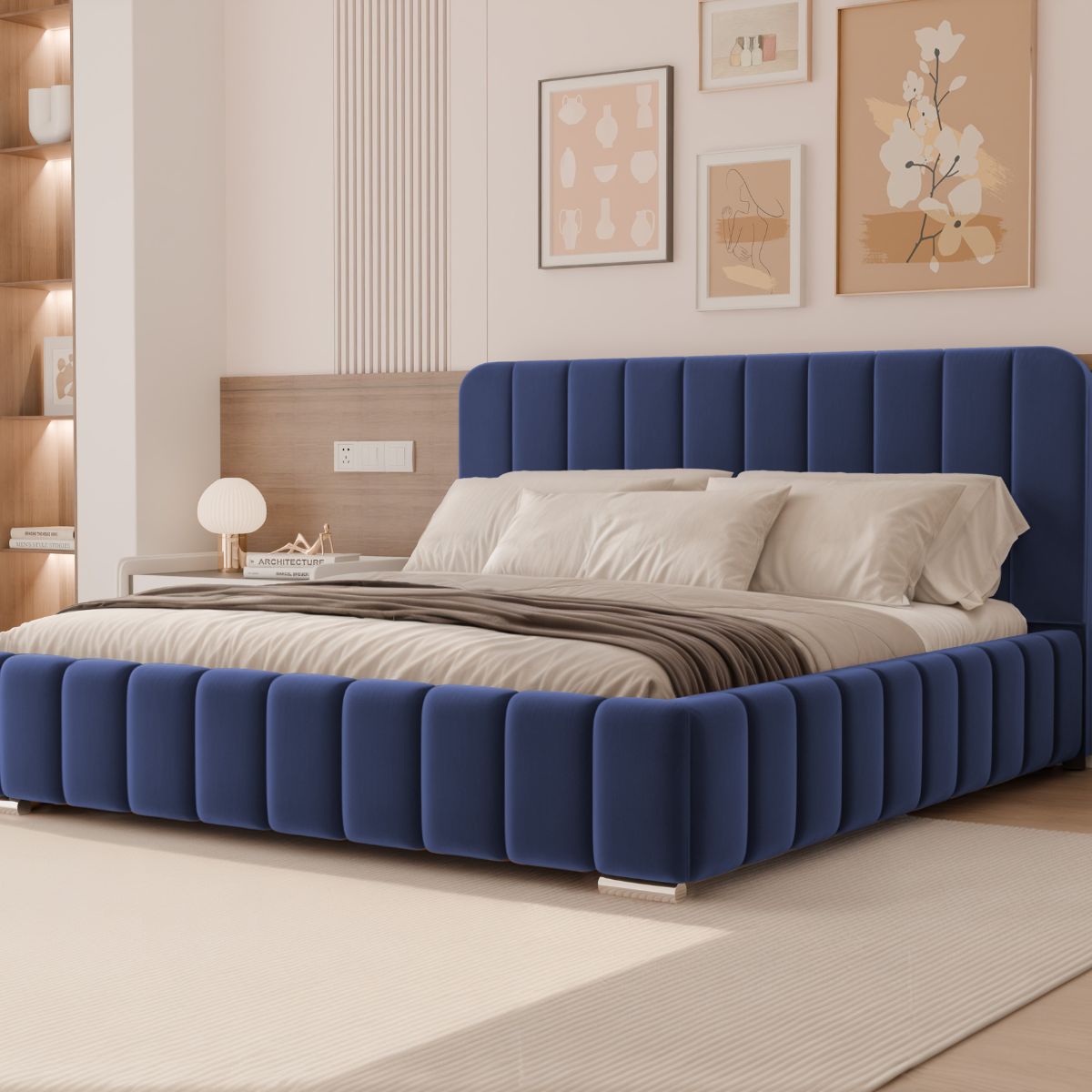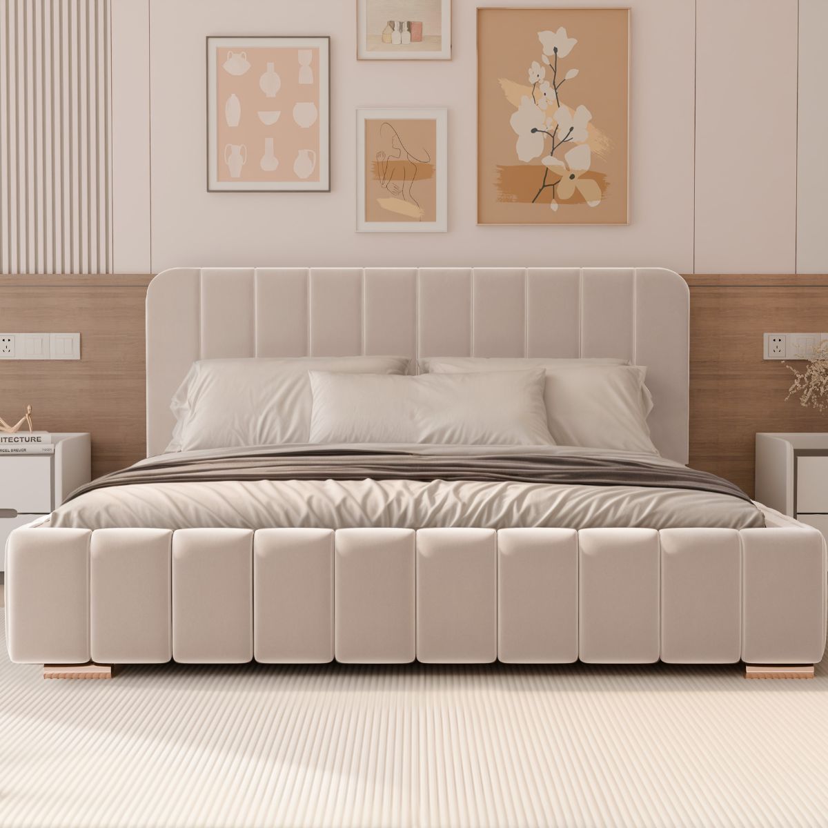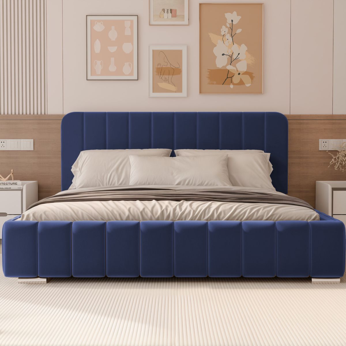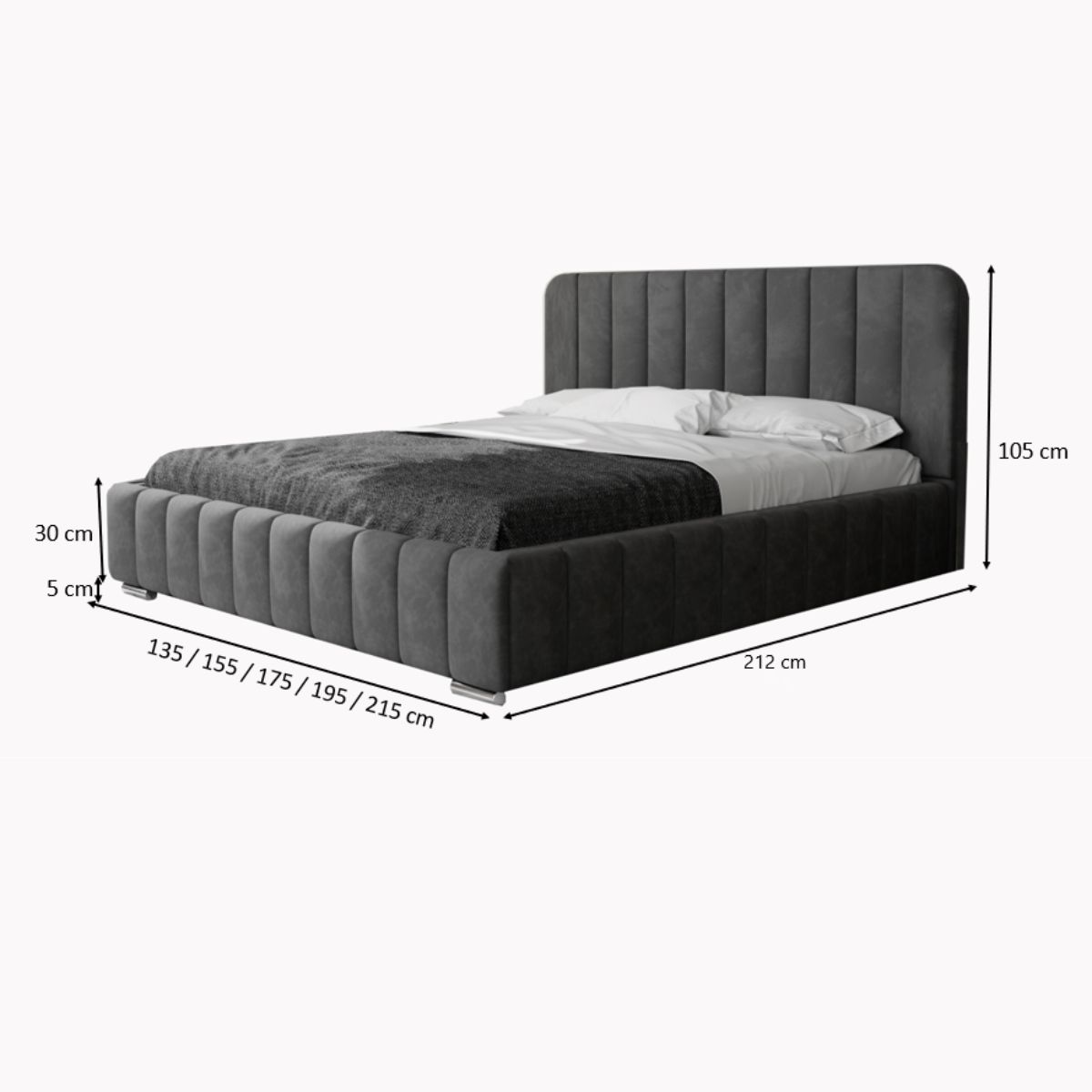 Łóżko tapicerowane osadzone jest na eleganckich nóżkach o wysokości 5 cm, dostępnych w dwóch wariantach wykończenia – chromowanym lub złotym. Subtelny połysk dodaje łóżku lekkości i nowoczesnego charakteru, a jednocześnie podkreśla jego stylowy wygląd.