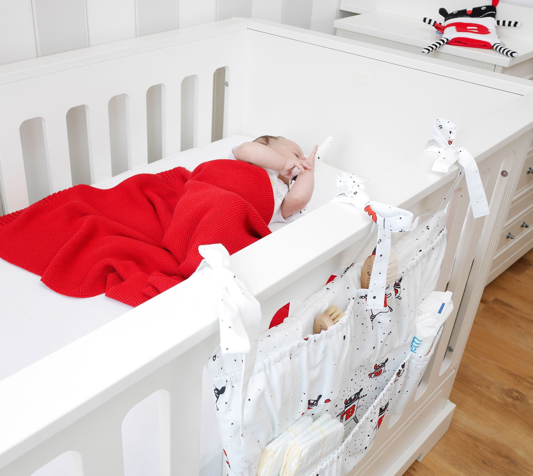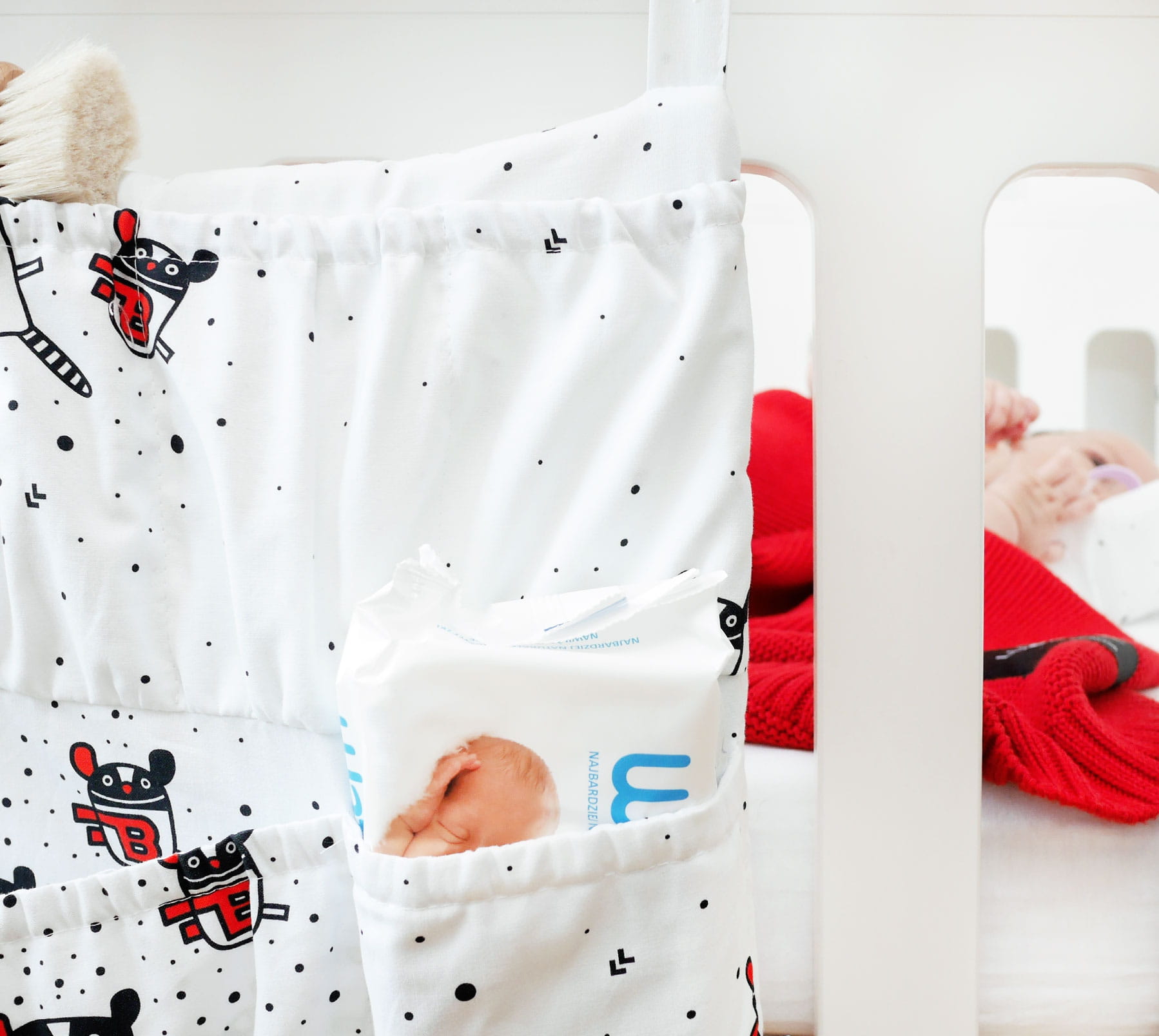Piękny i funkcjonalny organizer, który pomieści mokre chusteczki, pieluszki, ubranka, smoczki, zabawki czy butelki. Ułatwi opiekę nad maluszkiem i świetnie zorganizuje przestrzeń w sypialni.