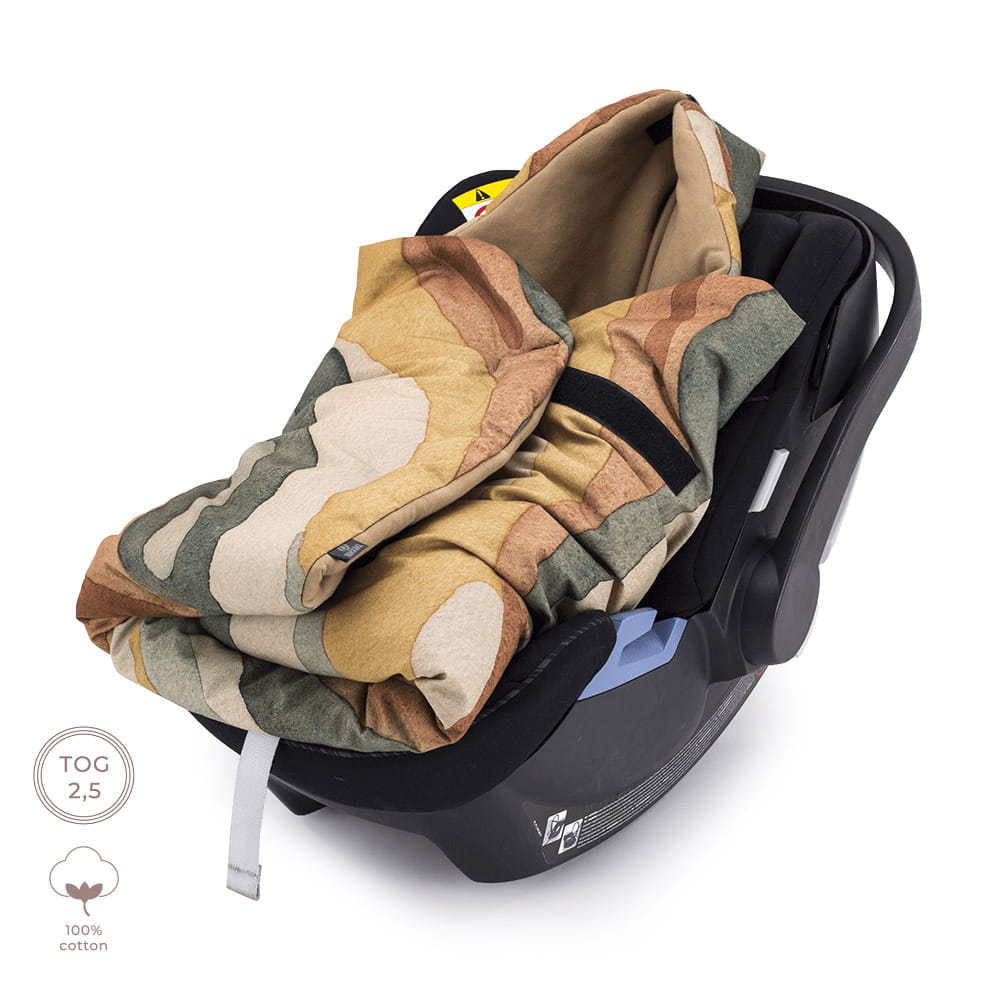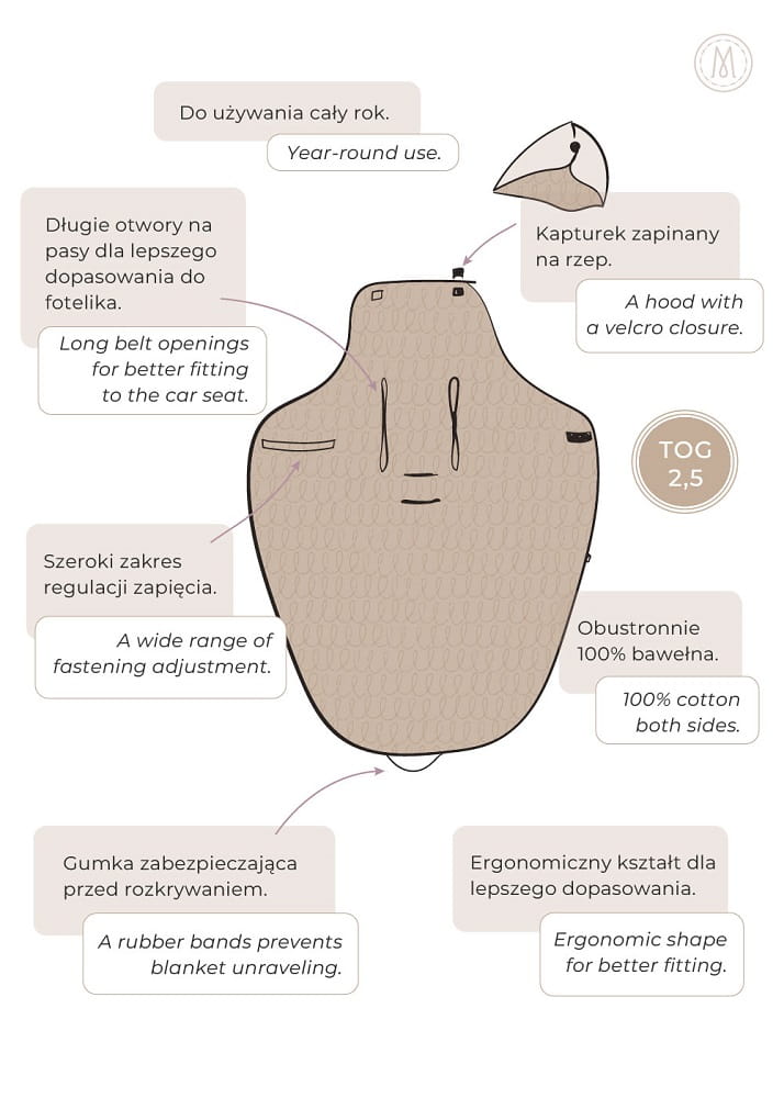 Otulacz do fotelika Makaszka dedykowany do fotelika samochodowego 0-13 i 9-18kg, do leżaczka, do gondoli czy łóżeczka. Idealny na wyjście ze szpitala po narodzeniu maluszka. Otula i zabezpiecza przed chłodem niemowlaka podczas transportu fotelika do samochodu i podczas jazdy. W trakcie postoju można odkryć boki otulacza oraz odpiąć kapturek, bez konieczności budzenia niemowlaka.