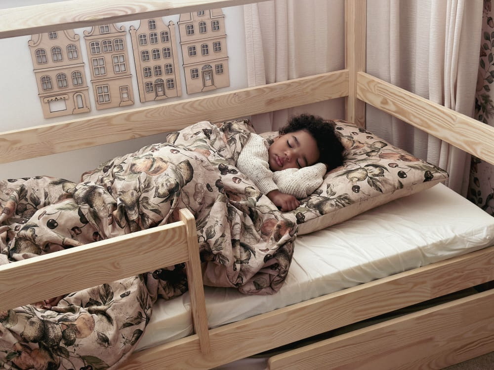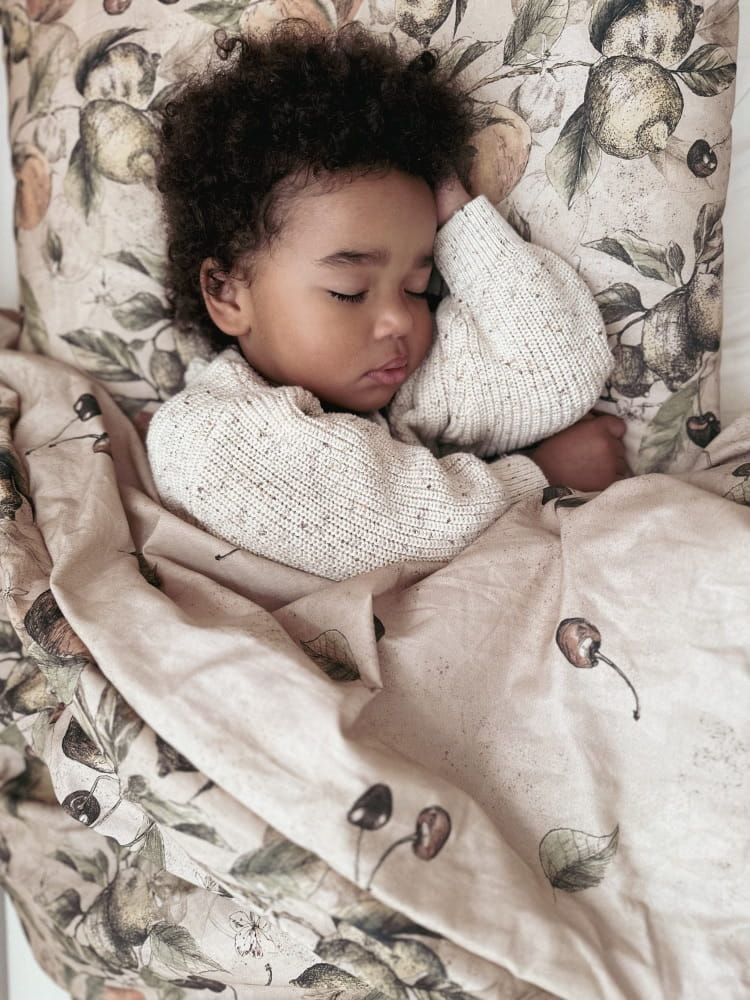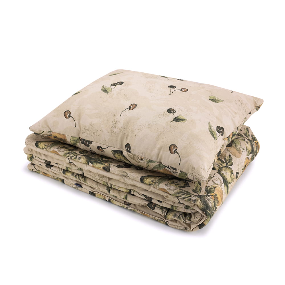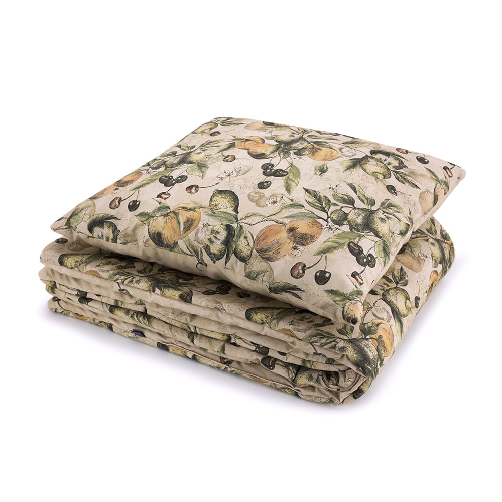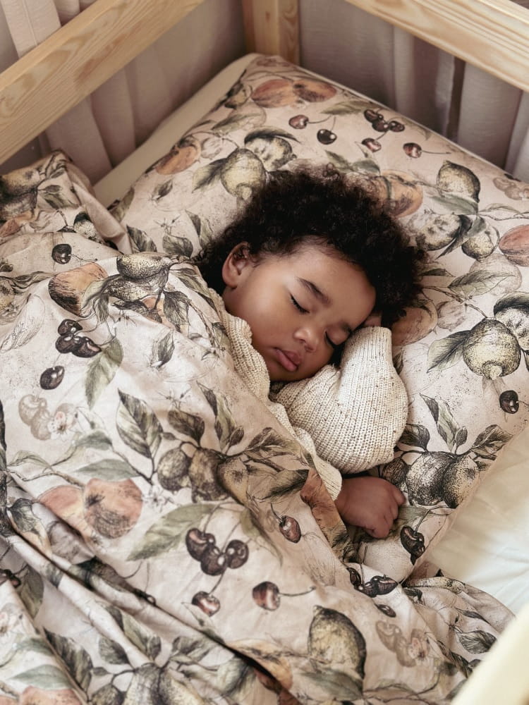 Pościel dziecięca vintage w przepięknym wzorze z owocami stworzy magiczny klimat w pokoju dziecka. Pościel z wypełnieniem Makaszka w rozmiarze 120x170 cm dedykowana jest dzieciom od 3 do 7 lat.