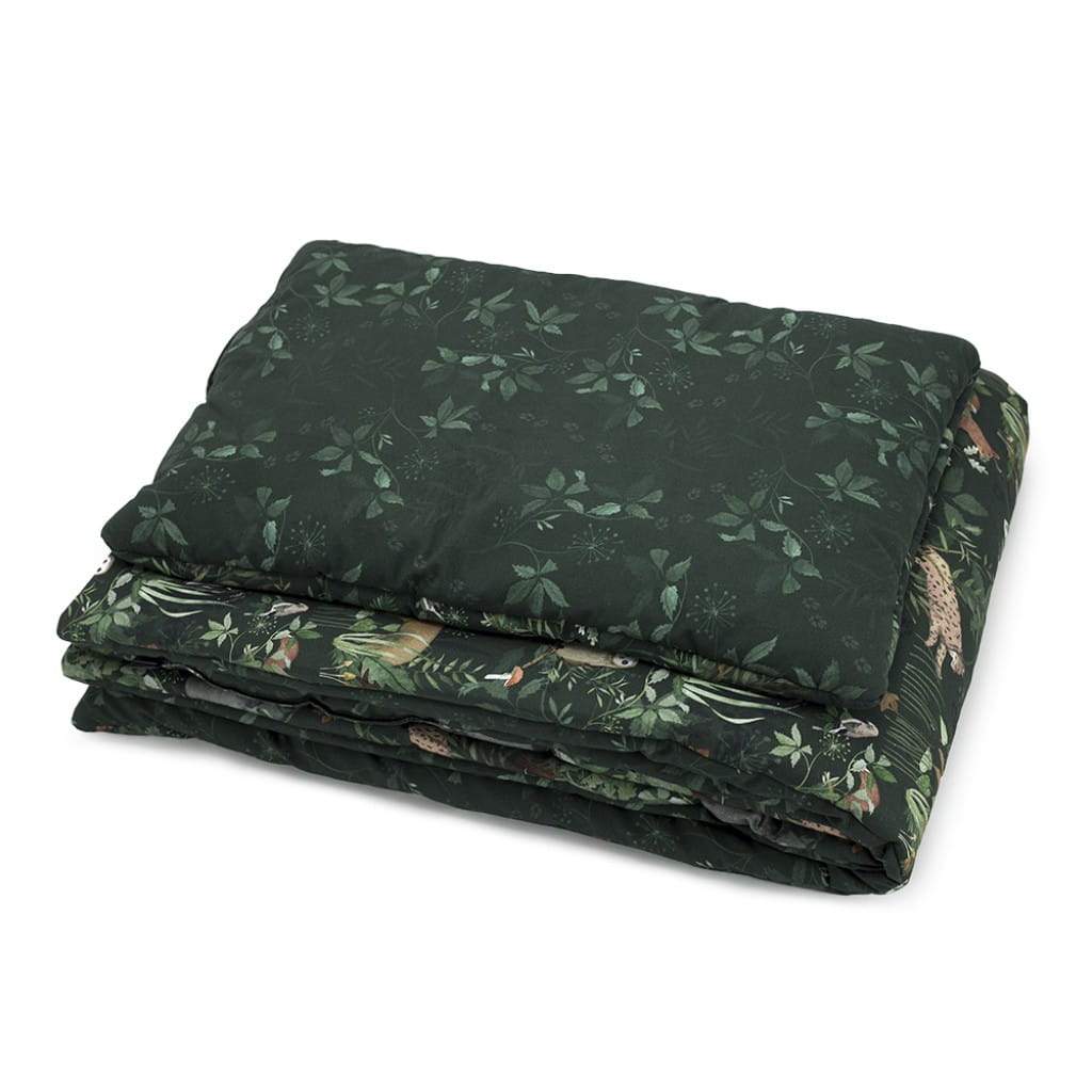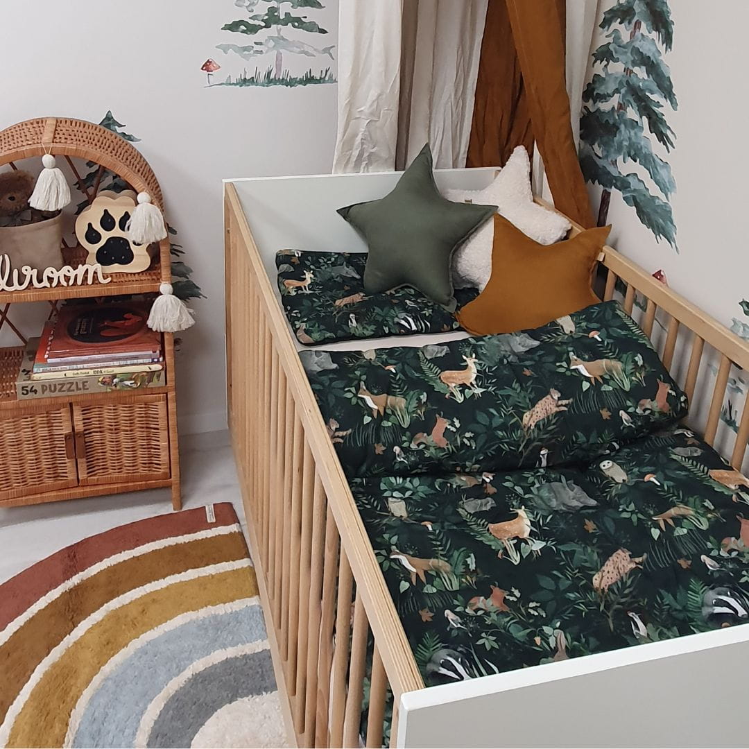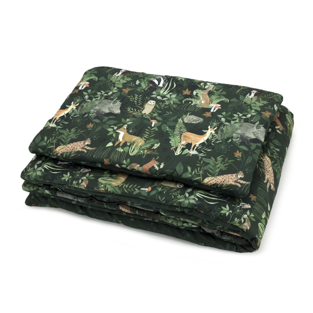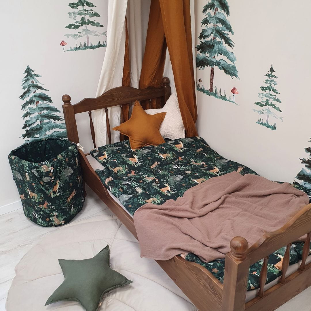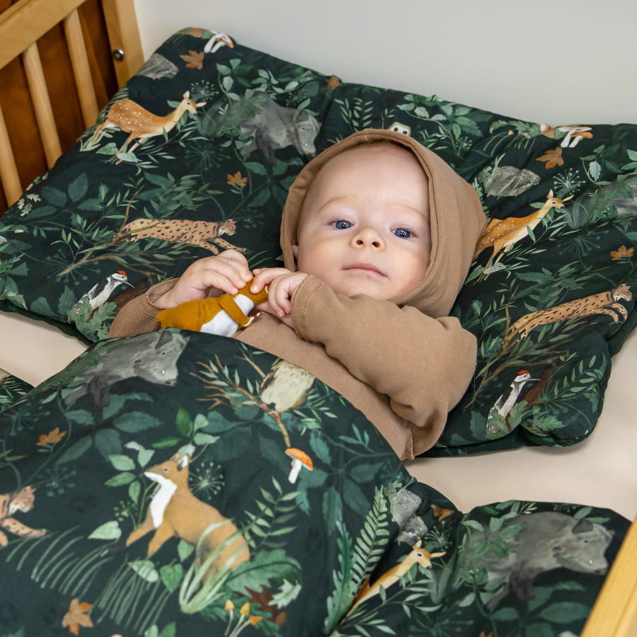 Leśny komplet pościeli dziecięcej z wszytym wypełnieniem, w przepięknym odcieniu butelkowej zieleni. Dzięki niej stworzysz cudowny, leśny klimat w pokoju dziecka. Pościel w rozmiarze 100x135 cm będzie idealna do leśnych pokoików.