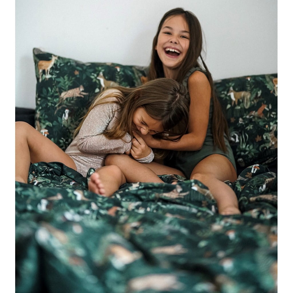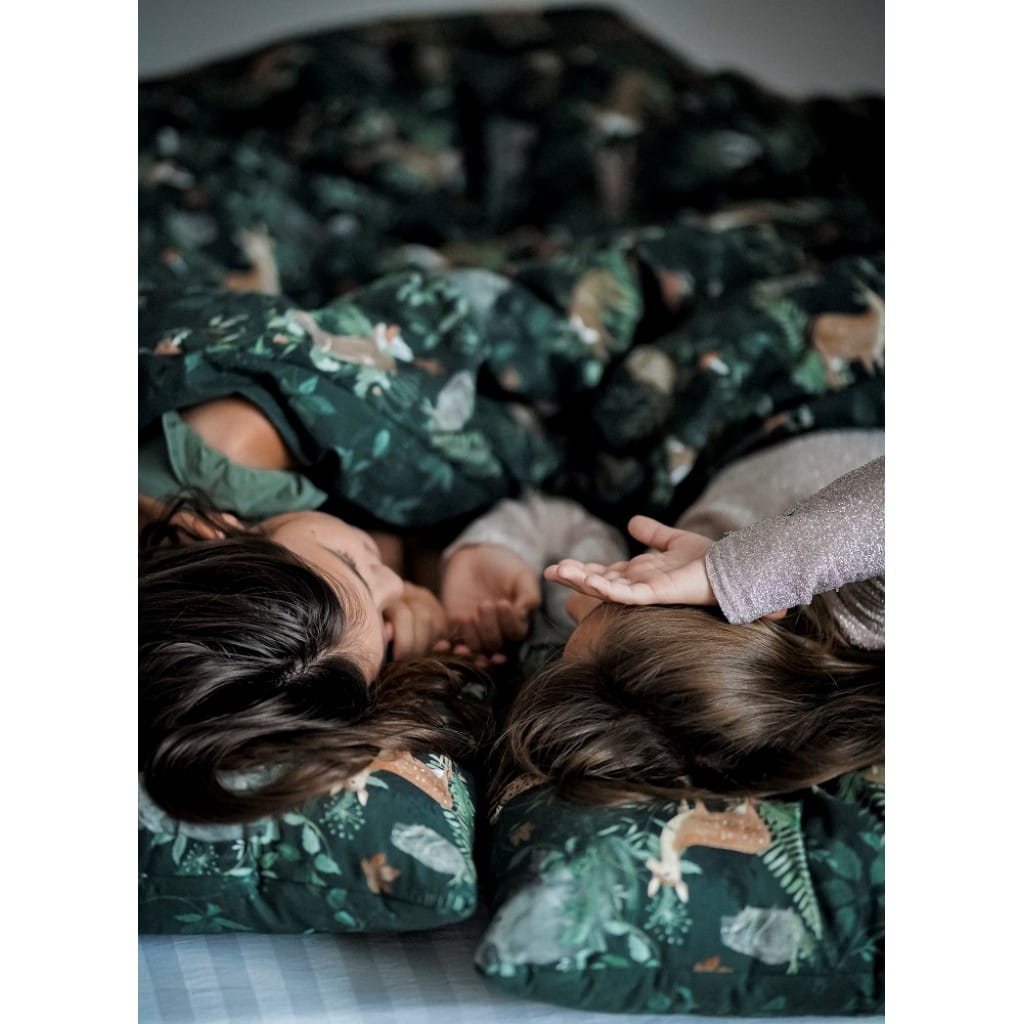 Komplet pościeli bawełnianej z wszytym wypełnieniem, w przepięknym odcieniu butelkowej zieleni z ulubionymi leśnymi zwierzakami. Pościel Woodland w rozmiarze 150x200 cm dedykowana starszym dzieciom i wszystkim dużym wielbicielom Makaszki :)