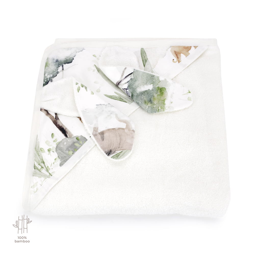 Sprawdzi się również na basenie, czy na plaży, otuli i ogrzeje delikatną skórę dziecka. Posiada praktyczny kapturek ze wzorem kolekcji Sawanna, na kapturku przesłodkie uszka, a cały jest obszyty elegancką lamówką. W górnym rogu ręczniczek ma troczek ułatwiający zawieszenie.