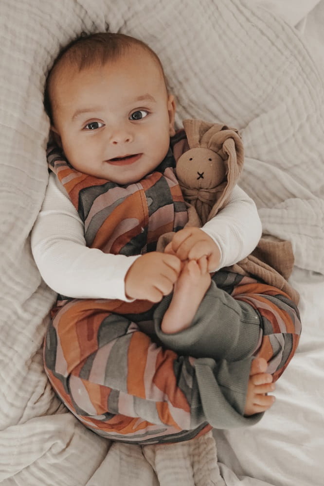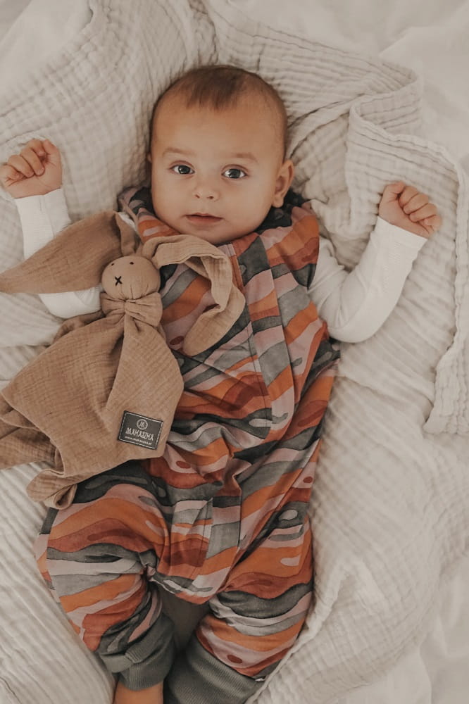 - tkanina zewnętrzna: organic jersey - 95% bawełna 5% elastan. Nadruk na bawełnie nie zmienia kolorów nawet po wielokrotnym praniu;