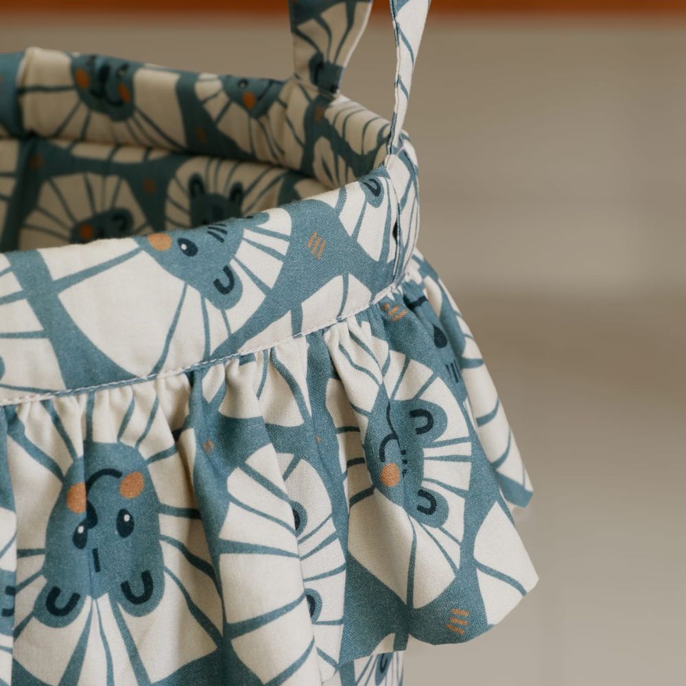 Wykończenie subtelną falbanką sprawia, że kosz na zabawki to wybór dla rodziców, którzy szukają produktów łączących rzemieślniczą precyzję z nowoczesną funkcjonalnością.
