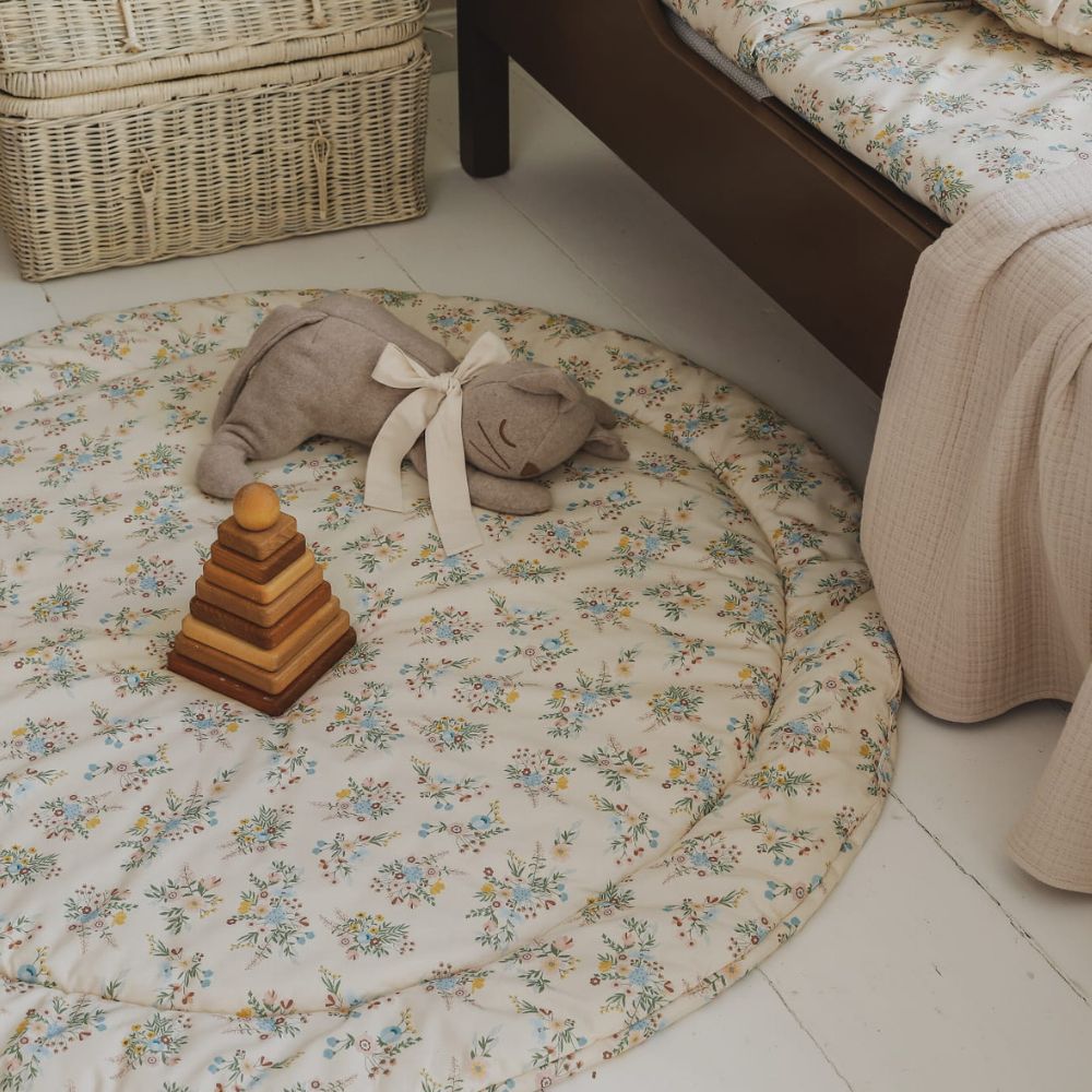 Okrągły kształt i nastrojowa kolorystyka sprawiają, że mata Blooming Meadow doskonale prezentuje się nie tylko w sypialni dziecka, ale także w salonie, wyznaczając estetyczny i bezpieczny kącik zabaw. To produkt, który rośnie razem z dzieckiem – od maty edukacyjnej po wygodny dywanik do kącika czytelniczego pod baldachimem.