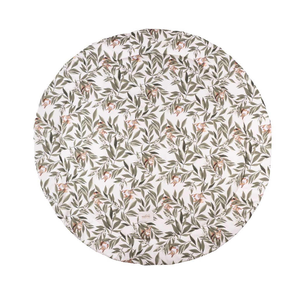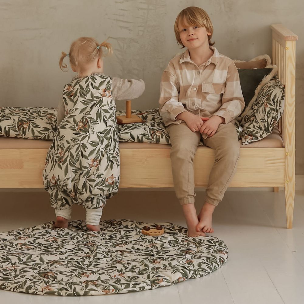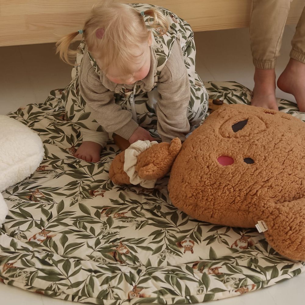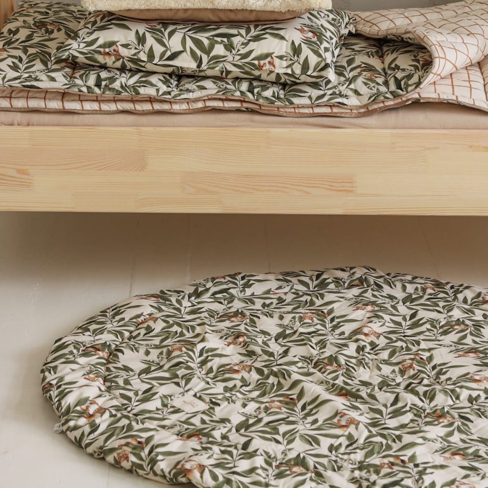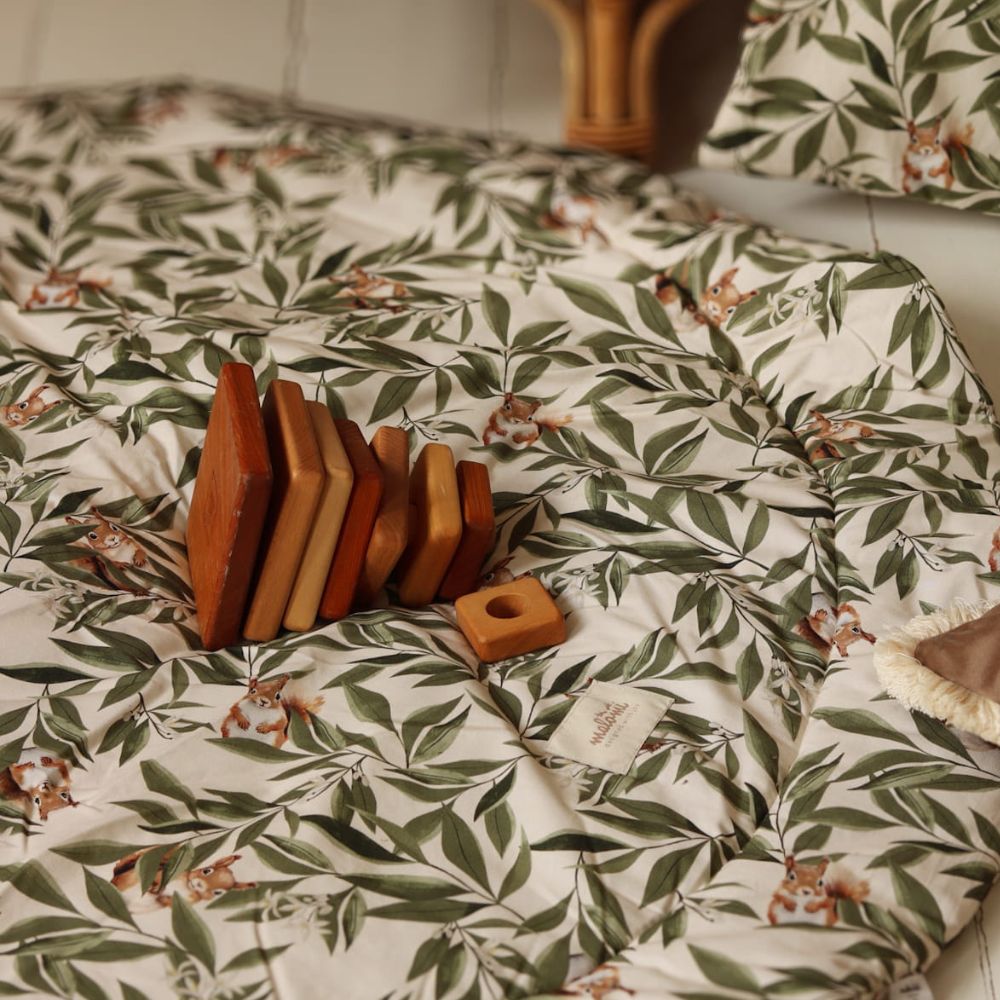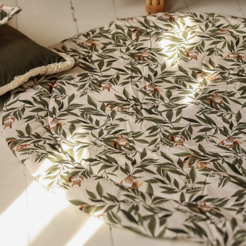 Stwórz swojemu maleństwu idealne miejsce do poznawania świata. Bawełniana mata do zabawy Woodland to połączenie najwyższego komfortu z wyjątkowym designem, który przenosi magię lasu prosto do Twojego domu. Autorski wzór w delikatne liście i leśne zwierzątka sprawia, że mata jest stylowym elementem dekoracyjnym, który doskonale odnajdzie się w pokoju dziecięcym, jak i w nowoczesnym salonie.