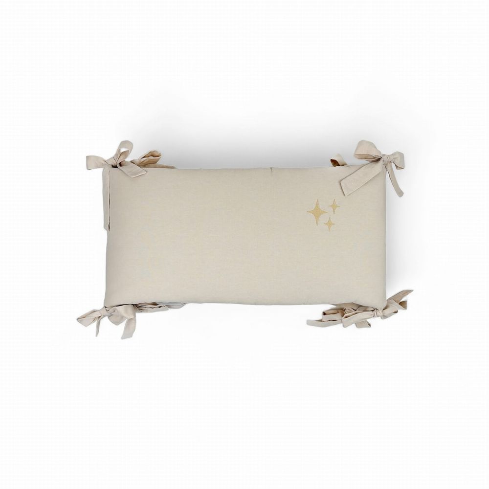 Środkowy panel ozdobiony został delikatnym haftem w gwiazdki, który nadaje całości wyjątkowego uroku. To dyskretna dekoracja, idealnie wpisująca się w estetykę dziecięcych wnętrz – od stylu boho, przez skandynawski, aż po klasyczny. Ochraniacz wyposażony jest w ozdobne troczki, które umożliwiają łatwe i stabilne przymocowanie do łóżeczka. Po zawiązaniu tworzą one subtelne kokardki, stanowiące dodatkowy element dekoracyjny