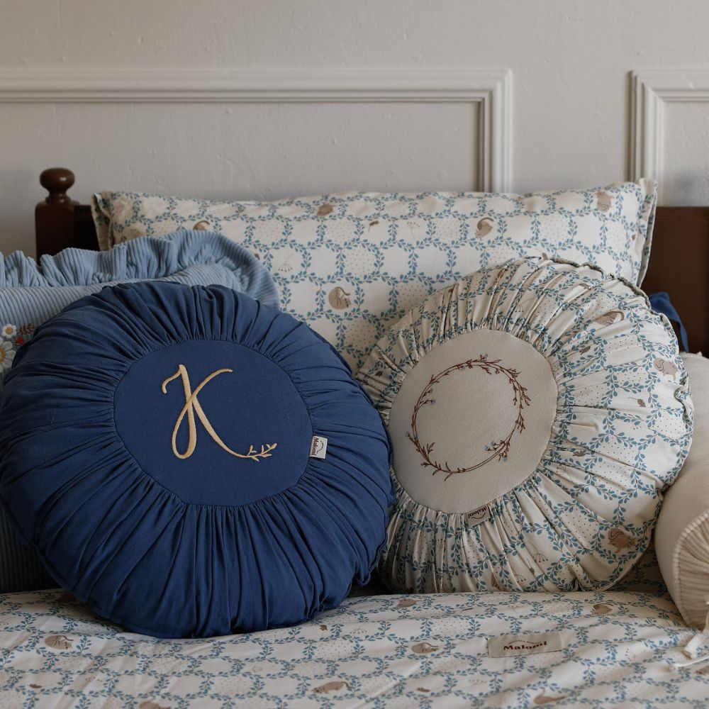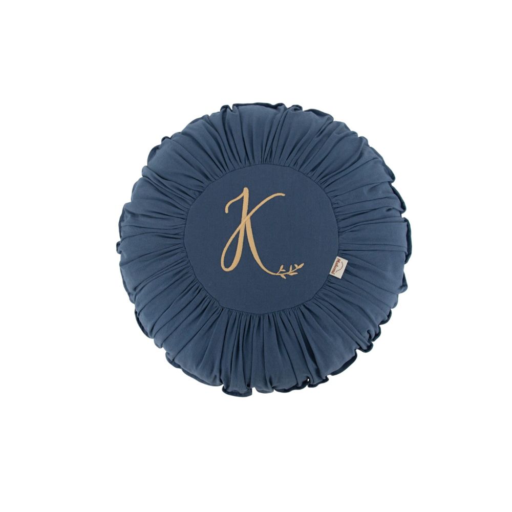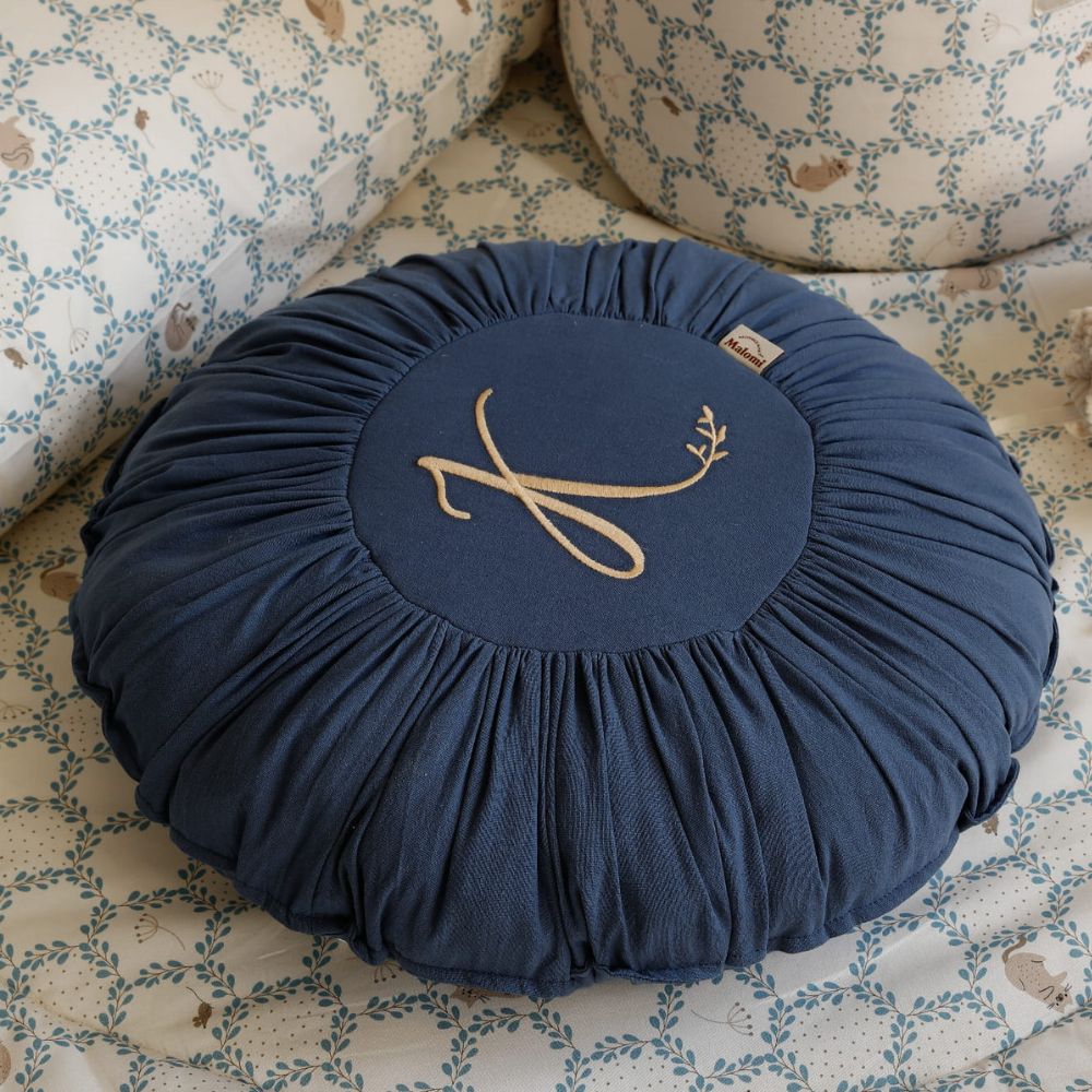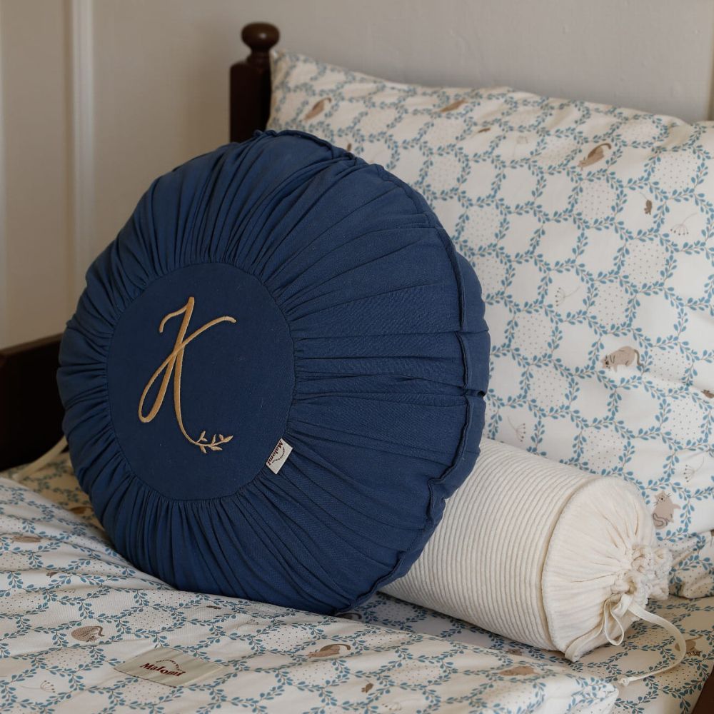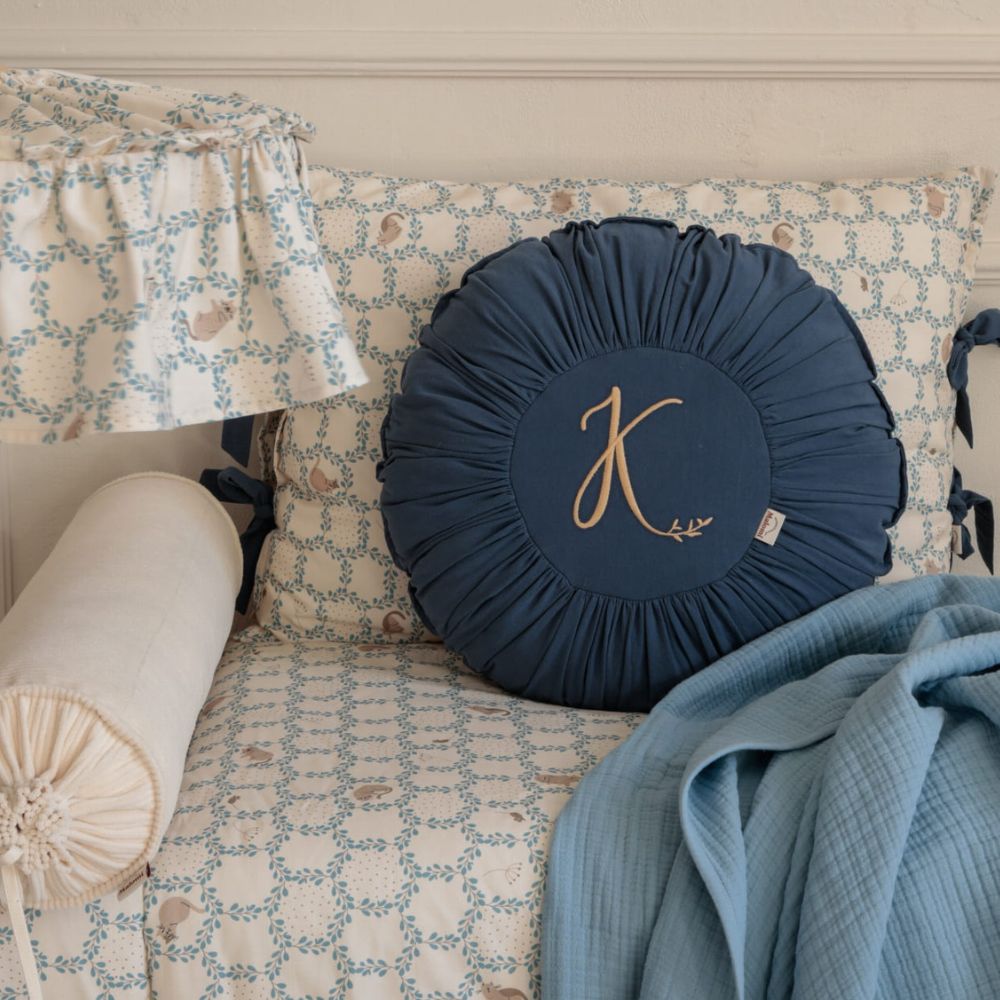 Okrągła poduszka z wyhaftowanym inicjałem zamieni zwykły dodatek w osobistą pamiątkę. Precyzyjnie wykonany haft na głębokim granacie Dark Blue prezentuje się niezwykle szlachetnie, idealnie wpisując się w estetykę nowoczesnych kącików dziecięcych. Wybierz haft z pierwszą literą imienia, aby stworzyć wyjątkowy dodatek premium, który podkreśli tożsamość małego właściciela i doda wnętrzu elegancji.