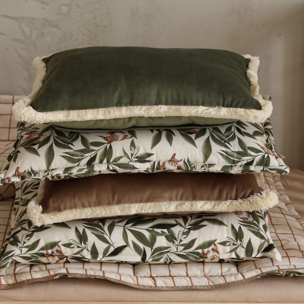 Poduszka Forest Green to nie tylko estetyka, ale i najwyższy komfort. Wykonana z mięsistego, luksusowego velvetu, jest niezwykle miła w dotyku i bezpieczna dla delikatnej skóry dziecka. Dzięki antyalergicznemu wypełnieniu świetnie sprawdzi się zarówno jako ozdoba łóżeczka, jak i towarzysz codziennych drzemek czy zabaw na dywanie.